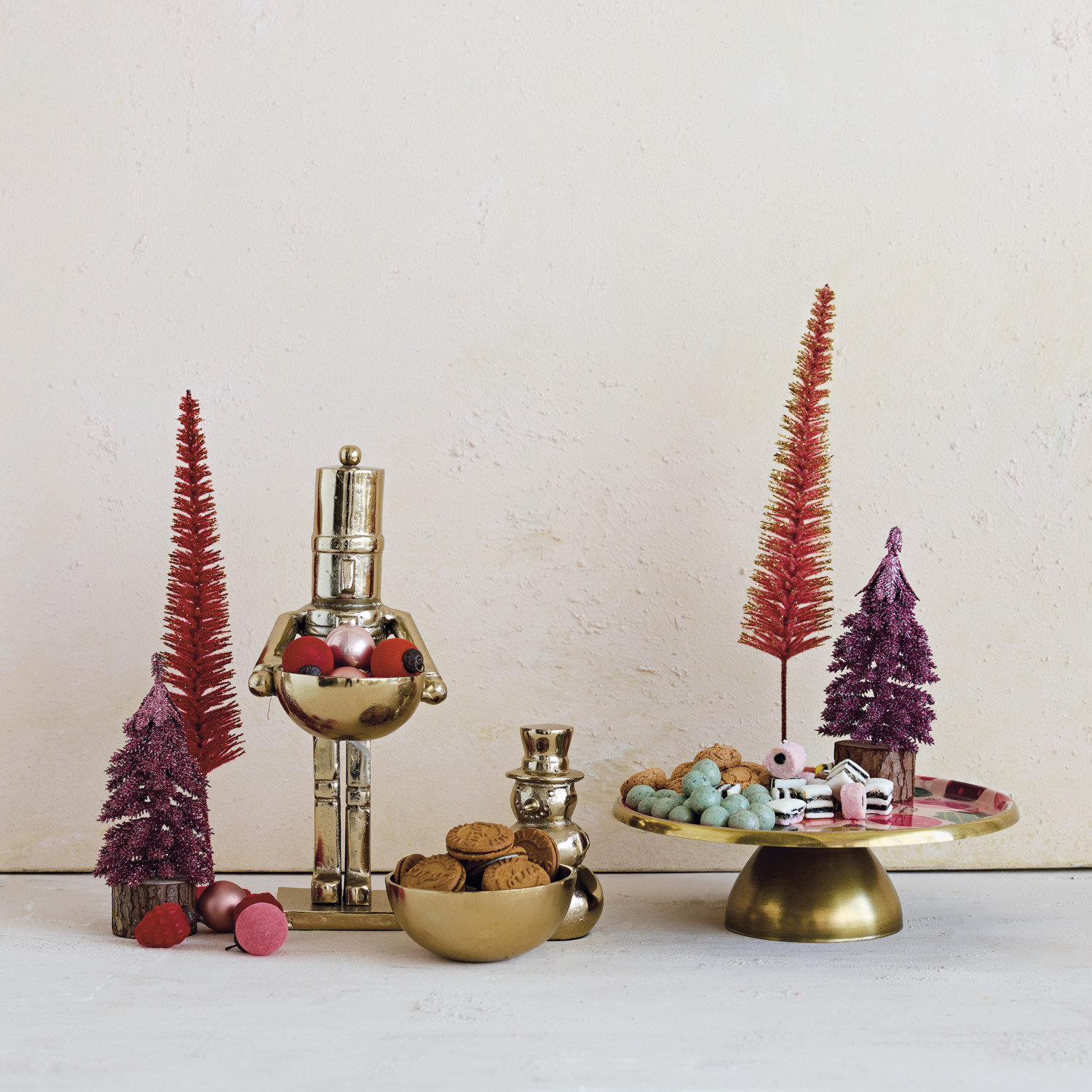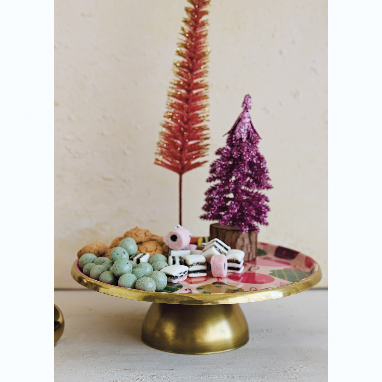 Catalog Name: 11" Round x 3-1/2"H Enameled Metal Pedestal w/ Ornaments Pattern, Multi Color & Gold Finish ©