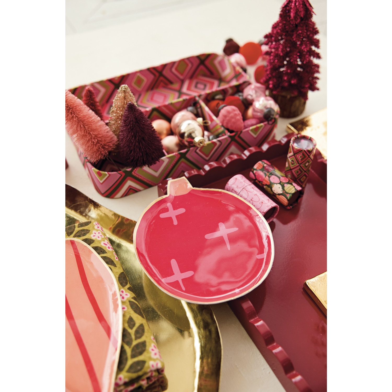 Catalog Name: 10-1/2"L x 6-1/4"W, 8-1/2"L x 4-1/4"W & 6-1/2"L x 5-1/4"W Enameled Metal Ornament Shaped Trays w/ Gold Edges, Multi Color, Set of 3 ©
