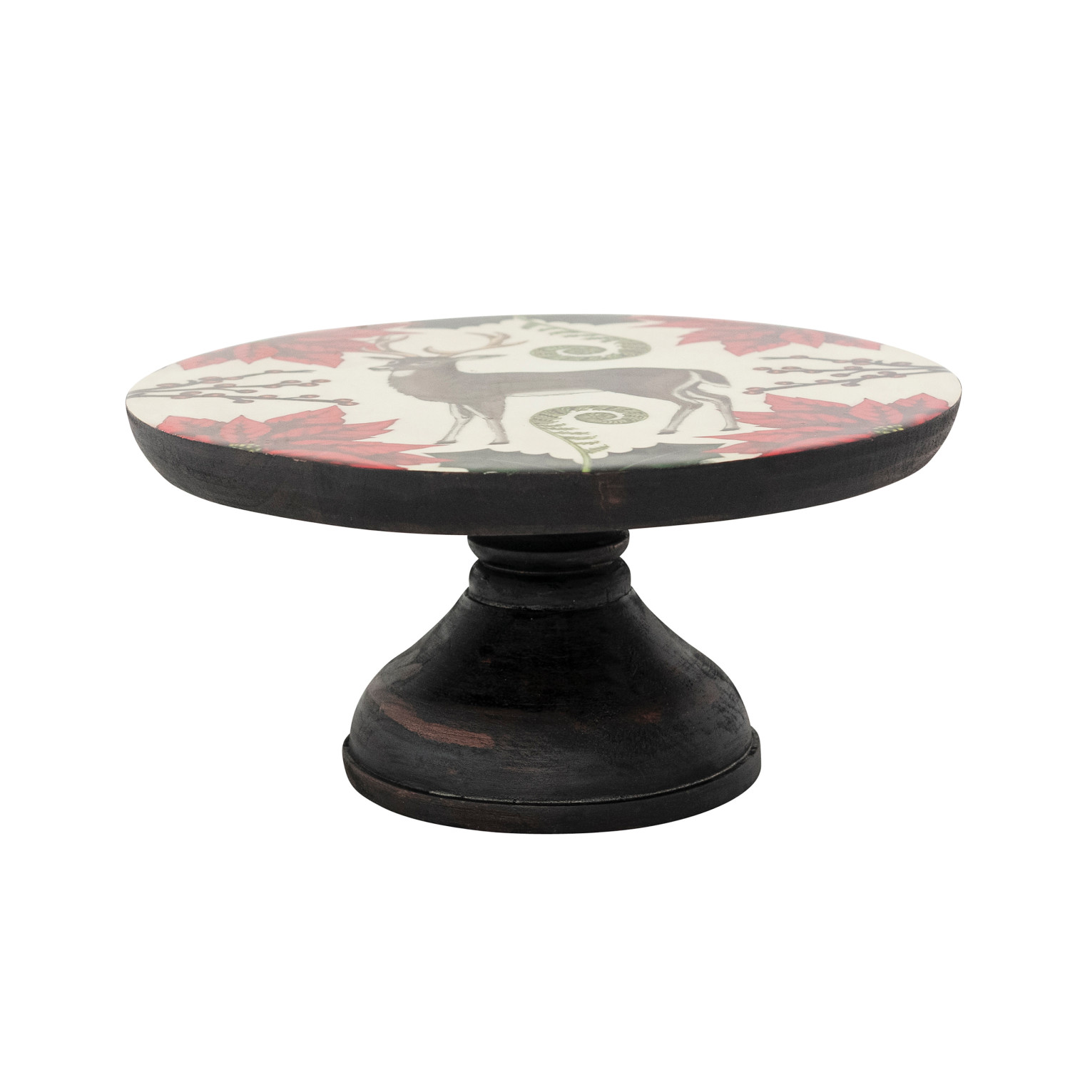 Catalog Name: 11-3/4" Round x 5-3/4"H Enameled Mango Wood Pedestal w/ Seasonal Botanicals & Deer, Multi Color & Espresso Finish ©