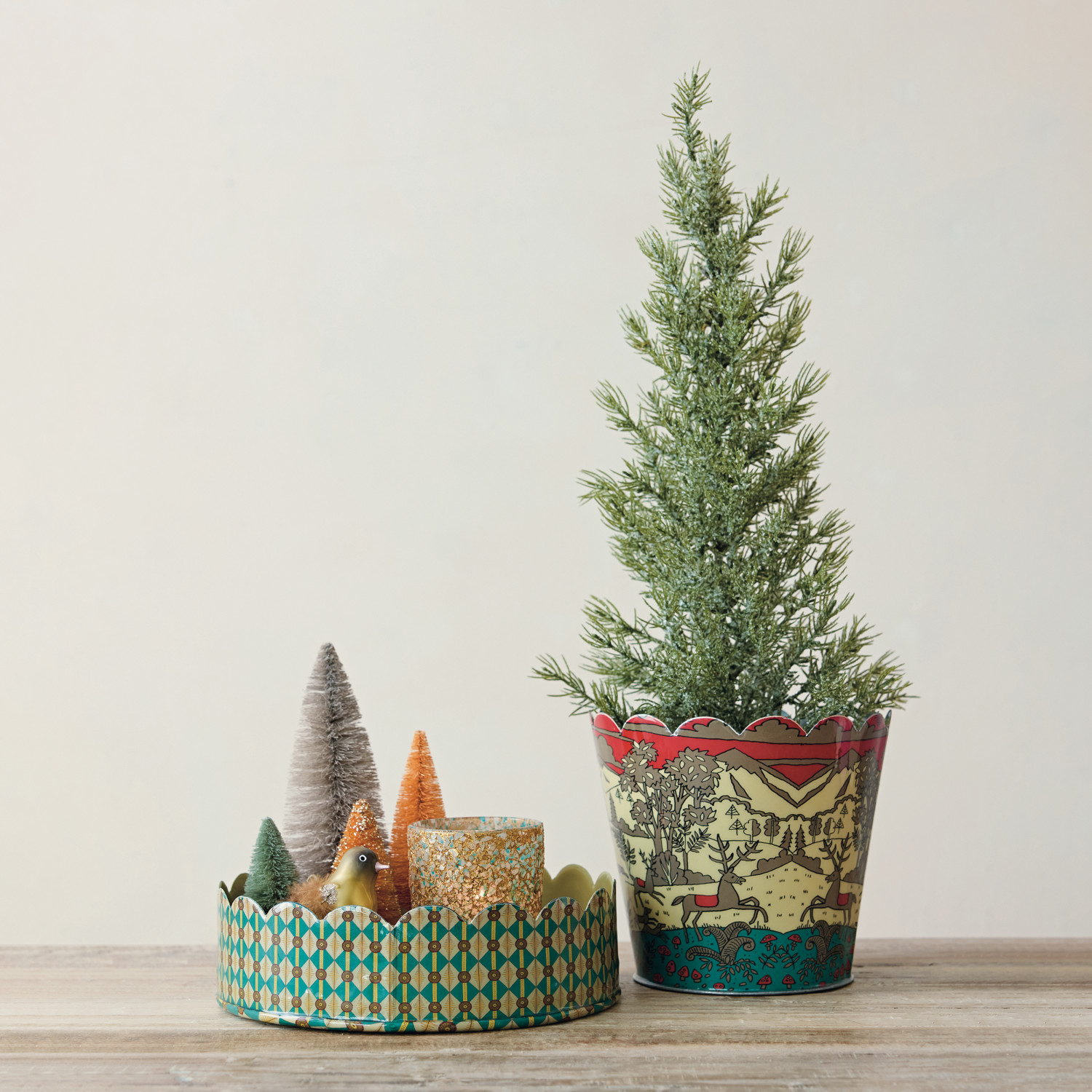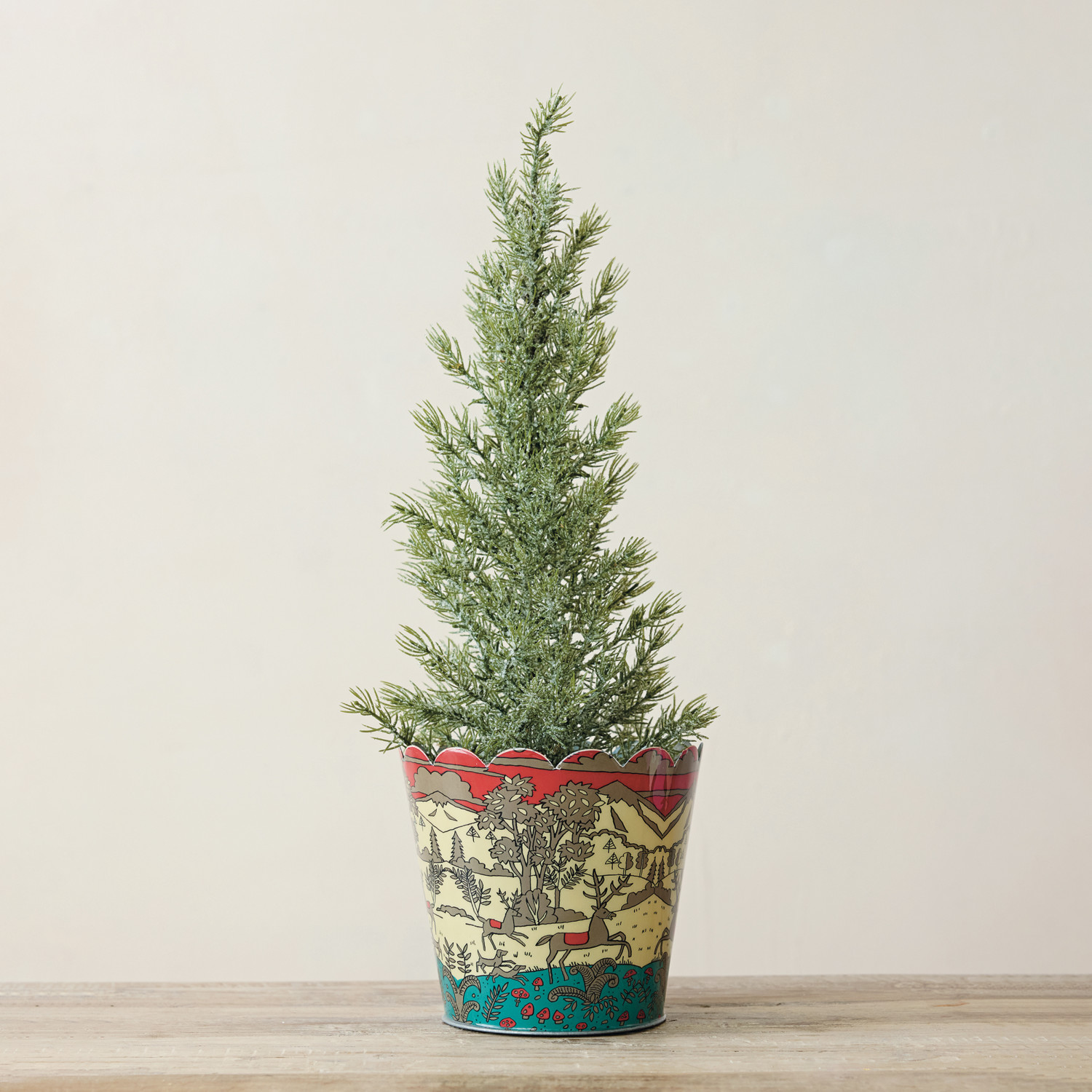 Catalog Name: 7" Round x 6-1/4"H Enameled Galvanized Metal Scalloped Planter/Container w/ Winter Scene & Reindeer, Multi Color (Holds 4-1/2" Pot) ©