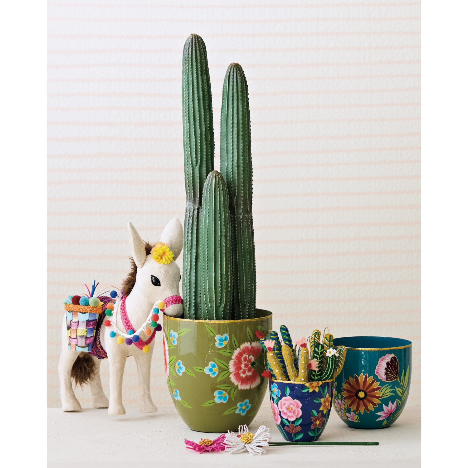 Hand-Painted Enameled Metal Planters with Flowers & Gold Rims, Set of 3