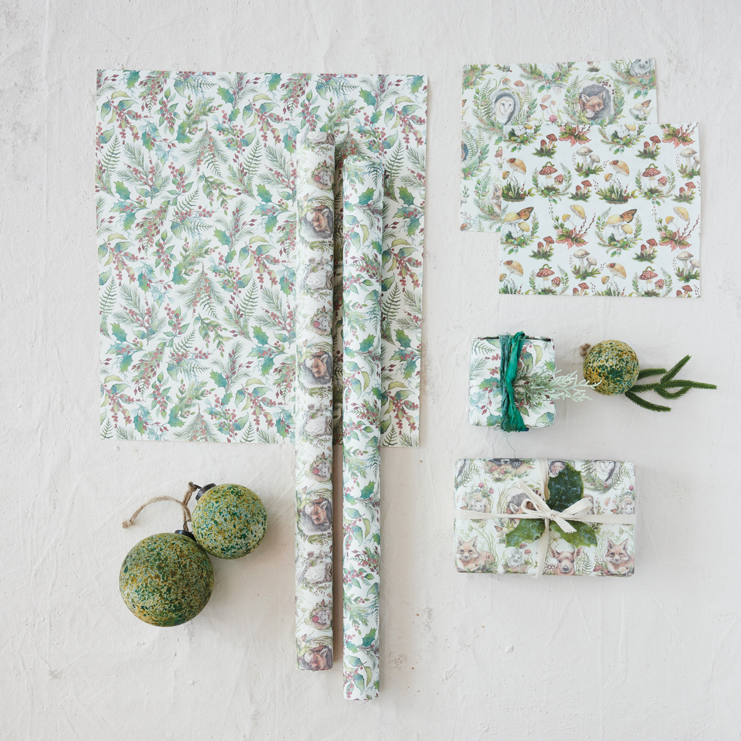 Catalog Name: 28"L x 20"W Handmade Printed Recycled Wrapping Paper Sheets w/ Woodland Animals & Seasonal Botanicals Patterns, Multi Color, 4 Styles, Set of 12 Rolls in Kraft Display Box (3 Sheets Per Roll, 3 Rolls Per Style) ©