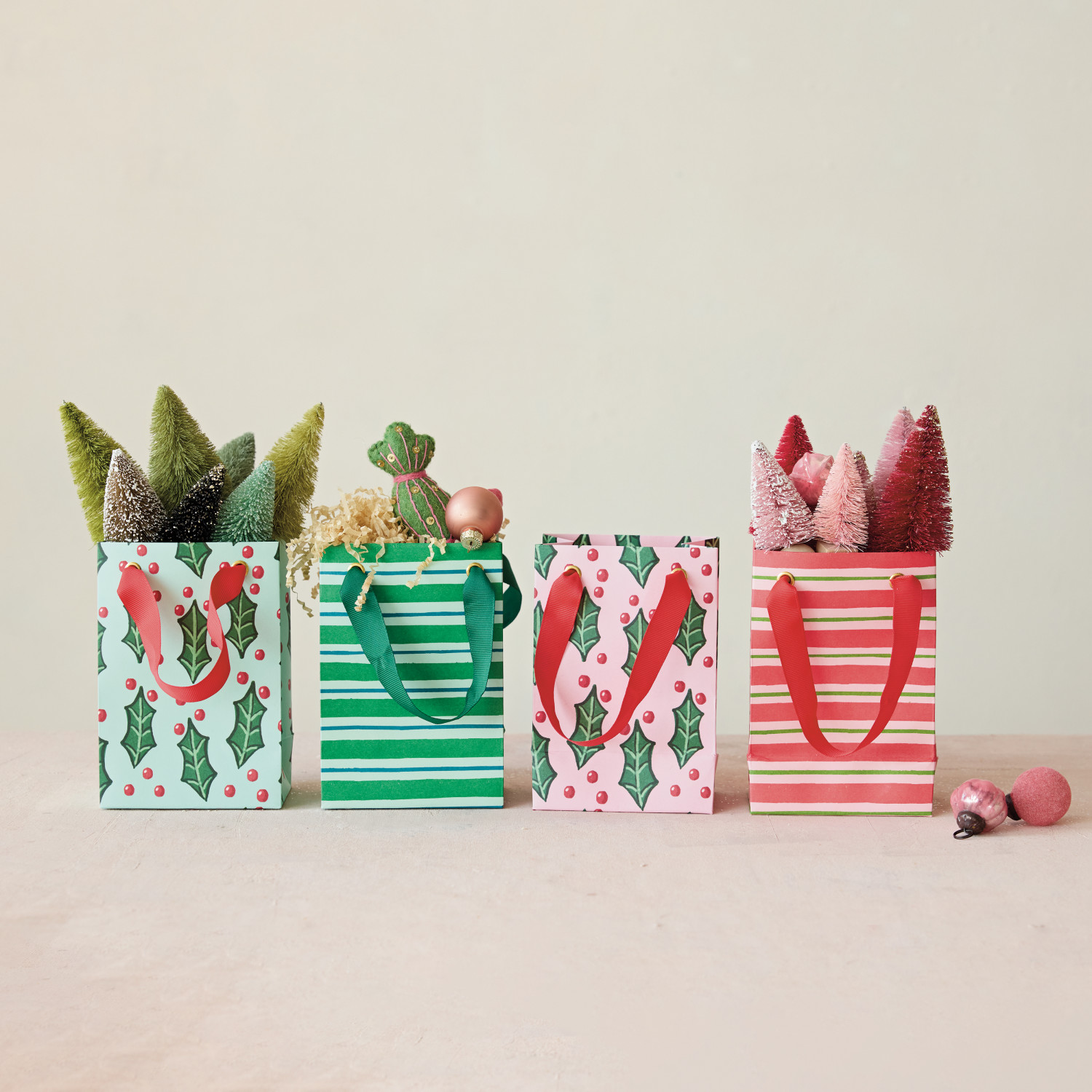 Catalog Name: 4-1/4"L x 2-3/4"W x 6-1/4"H Handmade Printed Recycled Paper Gift Bag w/ Stripes/Botanicals & Grosgrain Ribbon Handles, Multi Color, 4 Styles ©