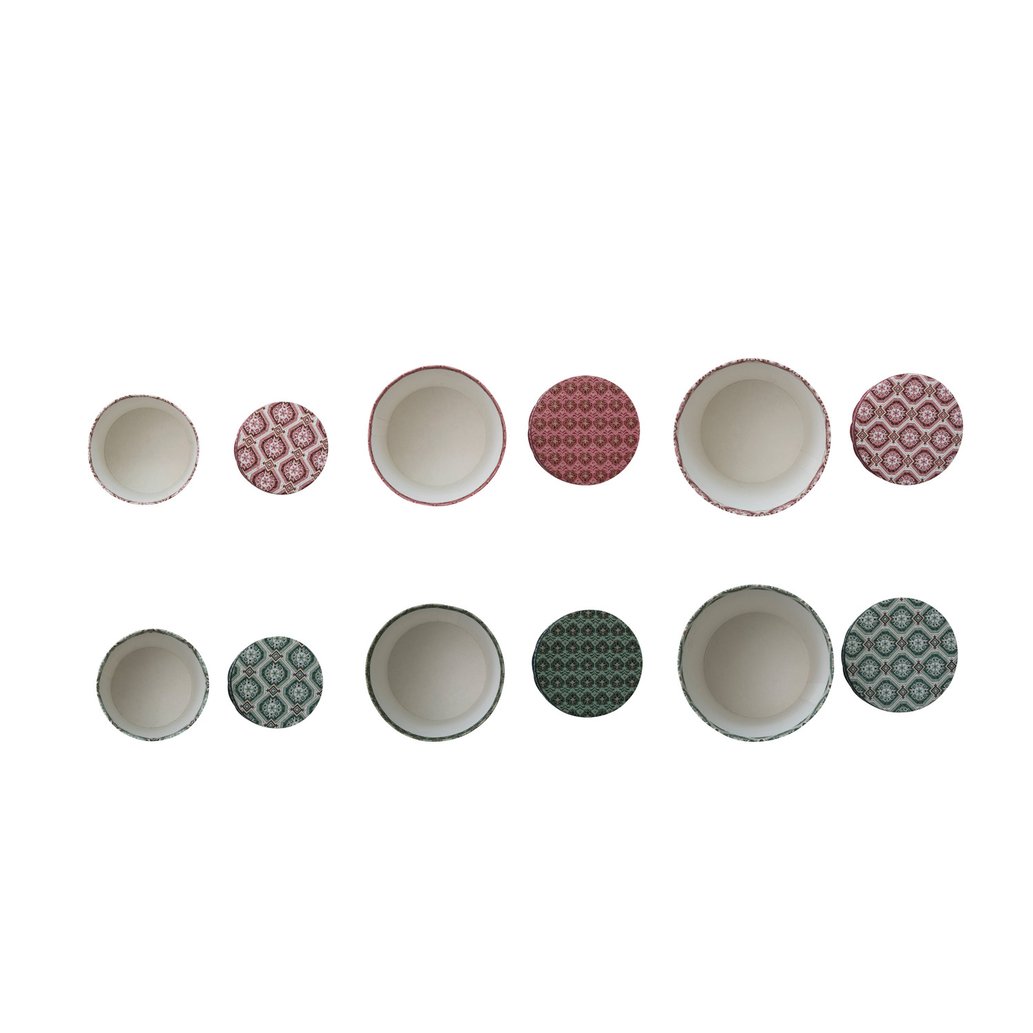 Catalog Name: 8-1/4" Round x 8"H, 7-1/4" Round x 7-1/4"H & 6-1/4" Round x 6"H Handmade Recycled Block Printed Paper Nesting Gift Boxes w/ Patterns & Scalloped Lids, Multi Color, Set of 3, 2 Colors