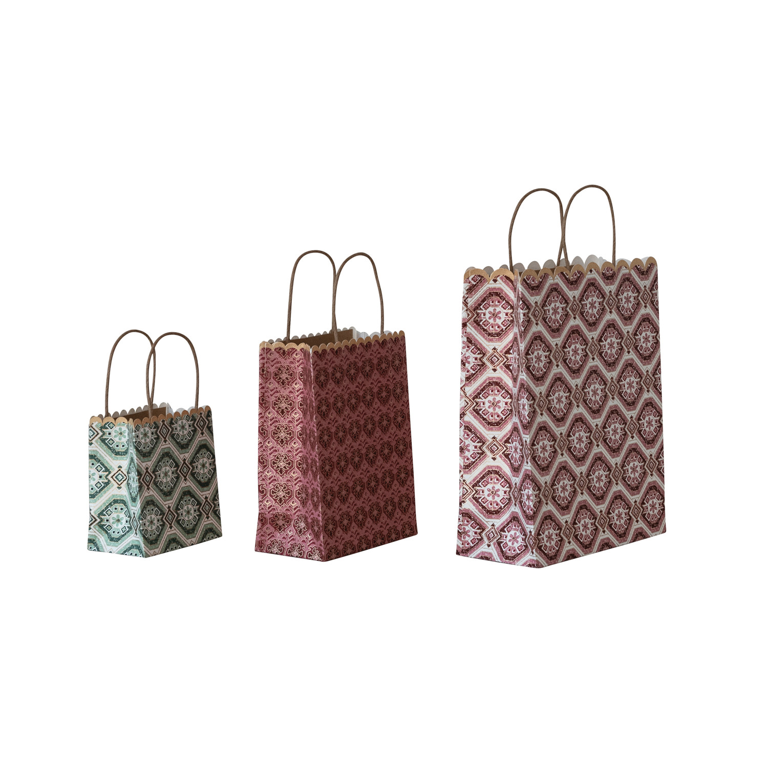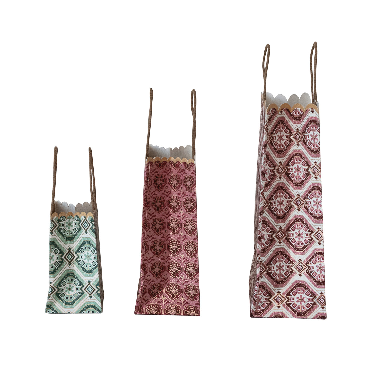Catalog Name: 9"L x 4"W x 11-1/2"H, 6-1/2"L x 3-1/2"W x 8-1/2"H & 5"L x 3"W x 5-1/2"H Handmade Recycled Block Printed Scalloped Paper Gift Bags w/ Patterns, Multi Color, Set of 3