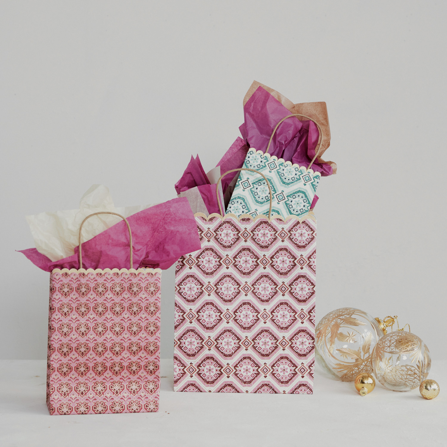 Handmade Recycled Block Printed Scalloped Paper Gift Bags with Patterns, Set of 3