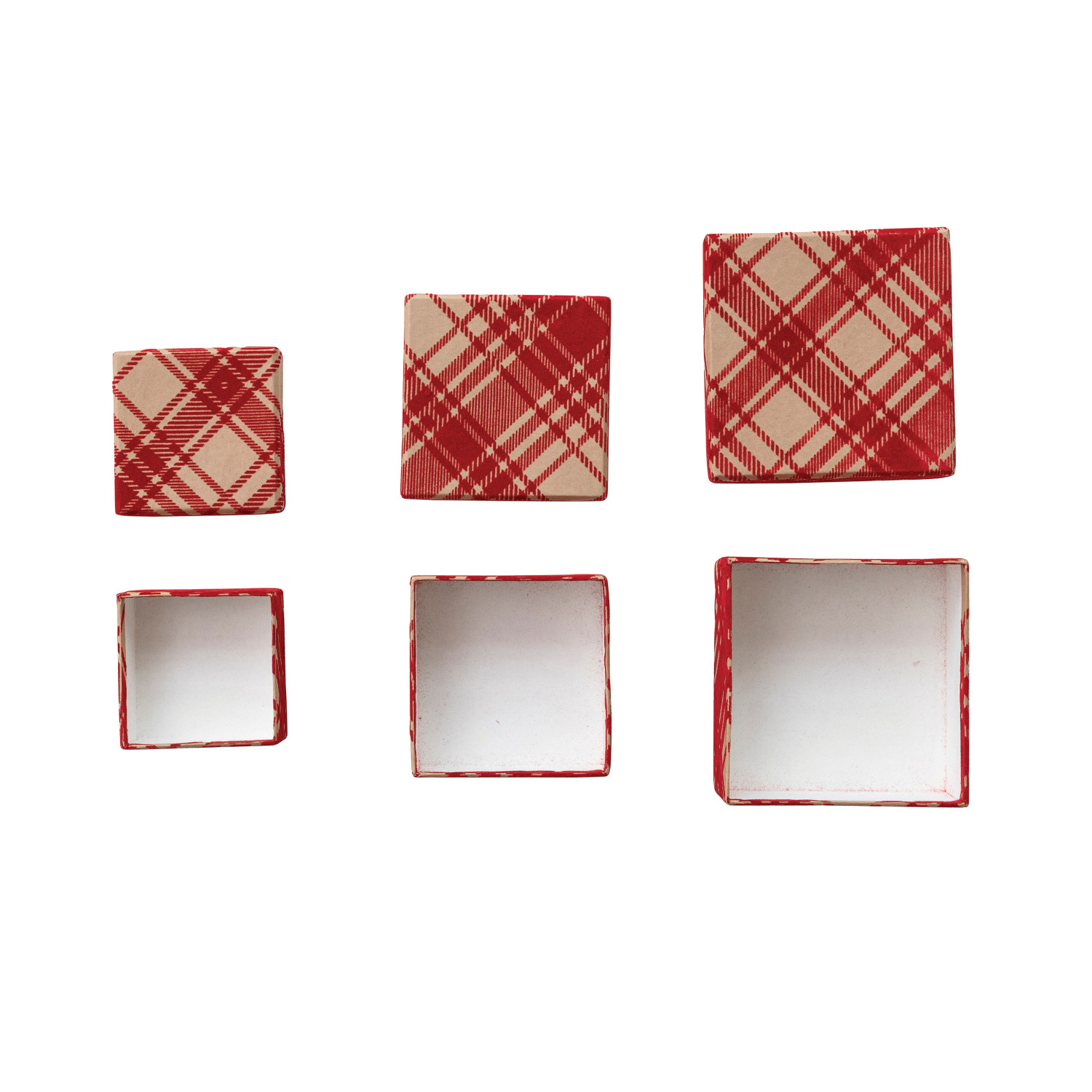 Catalog Name: 5-3/4" Square x 2-3/4"H, 4-3/4" Square x 2-1/4"H & 4" Square x 1-3/4"H Handmade Printed Recycled Flocked Kraft Paper Nesting Gift Boxes w/ Plaid Pattern, Red, Set of 3