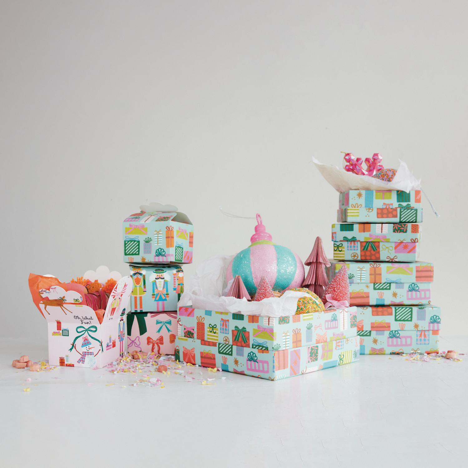 Catalog Name: 9-1/2" Square x 4"H, 8-1/2" Square x 3-1/2"H, 7-1/2" Square x 3"H, 6-1/2" Square x 2-3/4"H & 5-3/4" Square x 2-1/4"H Handmade Printed Recycled Paper Gift Boxes w/ Gift Box Pattern, Multi Color, Set of 5 ©