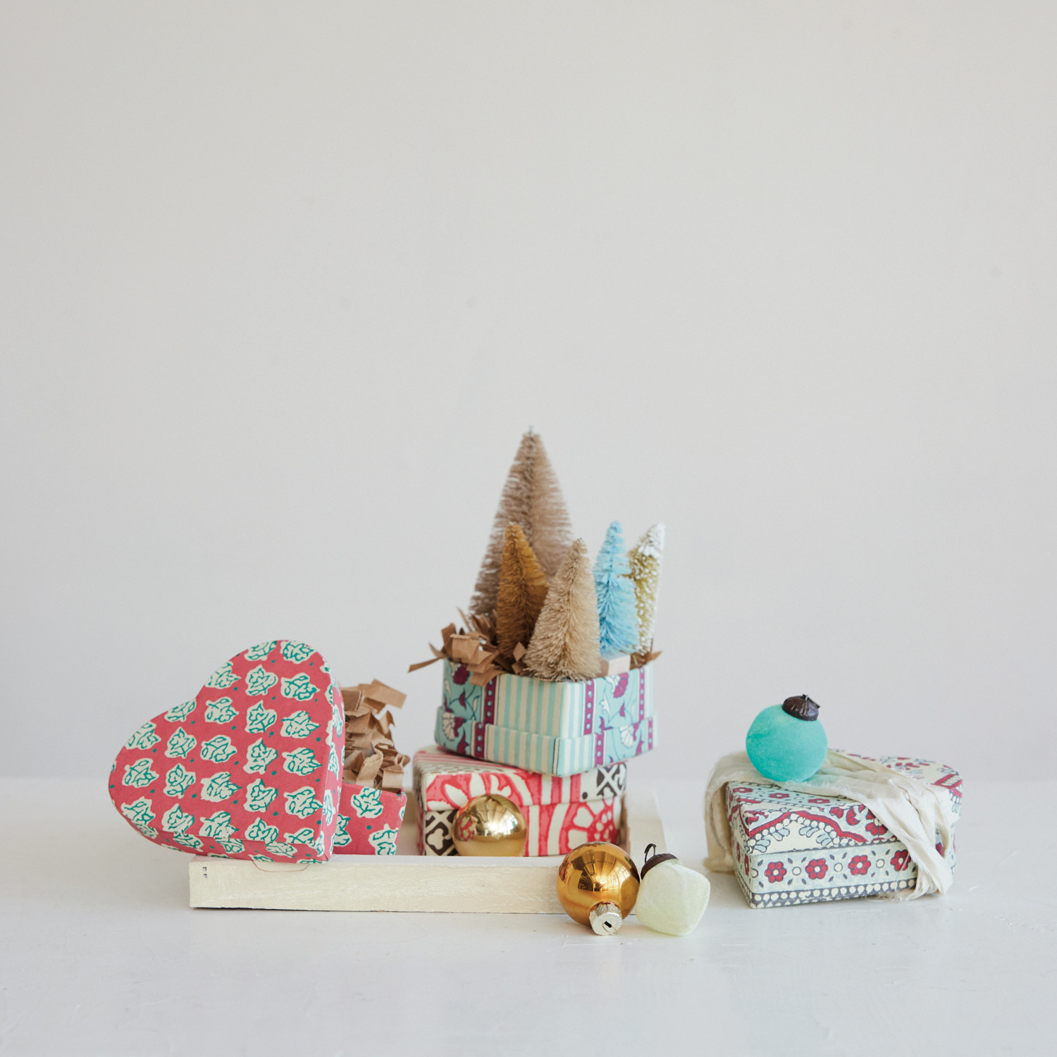 Catalog Name: 4-1/4"L x 4-1/4"W x 1-3/4"H Handmade Recycled Block Printed Paper Heart Shaped Gift Box w/ Vintage Pattern, Multi Color, 4 Styles
