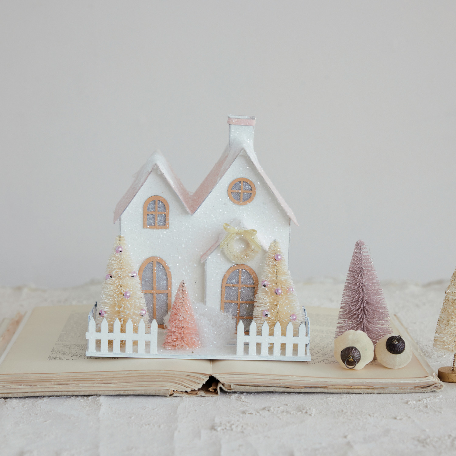 Paper House with Sisal Bottle Brush Trees, Glitter & LED Light (Batteries Included)
