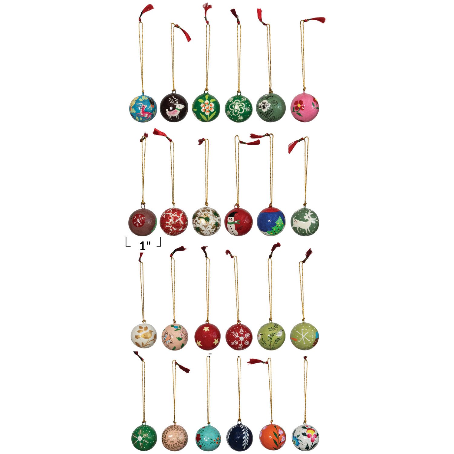 1" Round Hand-Painted Paper Mache Ball Ornaments in Egg Crate, Multi Color, Set of 24