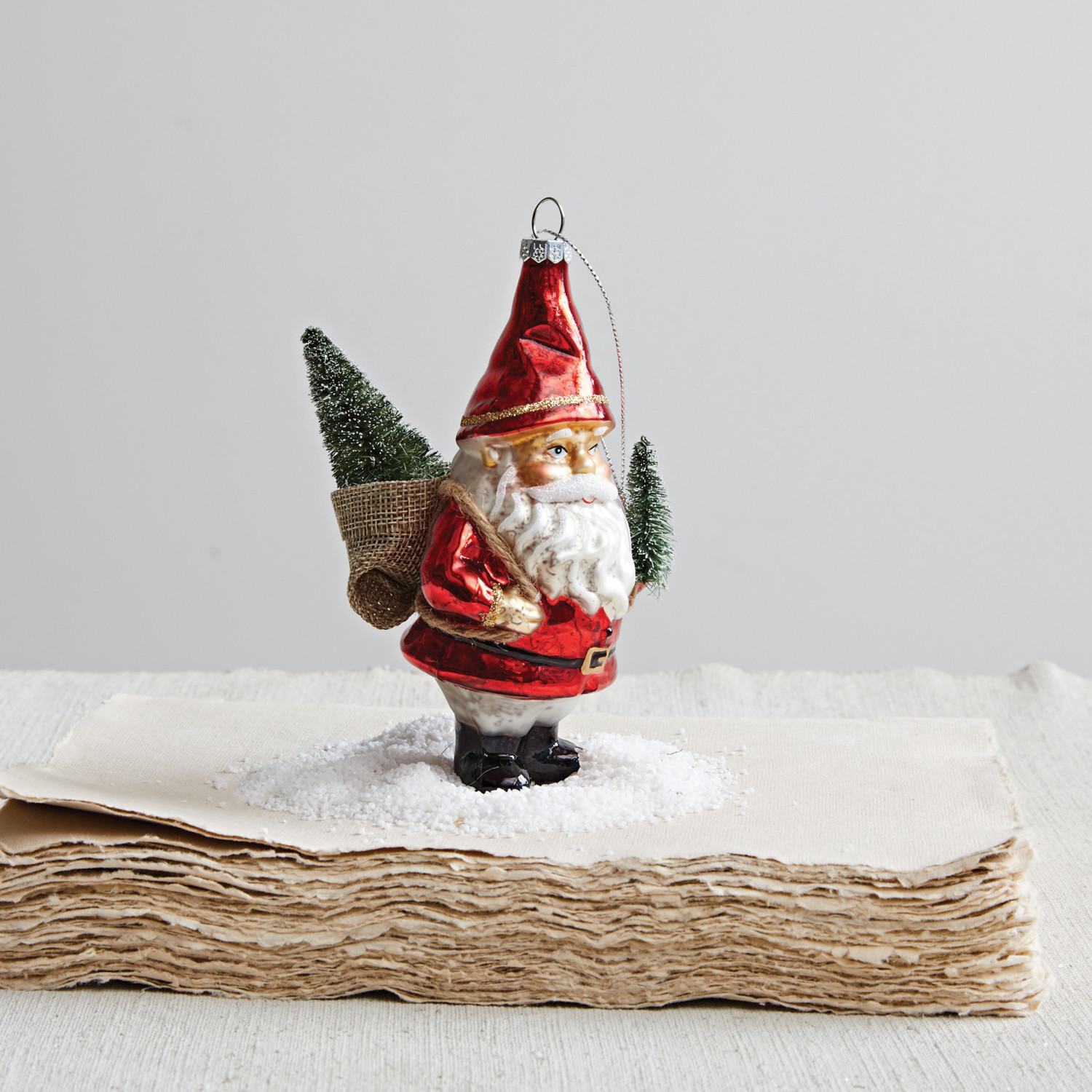 This vintage-inspired glass garden Santa ornament features hand-painted details, glitter, and a tiny sack of bottle brush trees on his back. Ornaments can be showcased as decorations on a Christmas tree, wreath, or atop a festive centerpiece, hung from doorways, displayed on mantels, used to embellish cards and presents, or given as gifts.