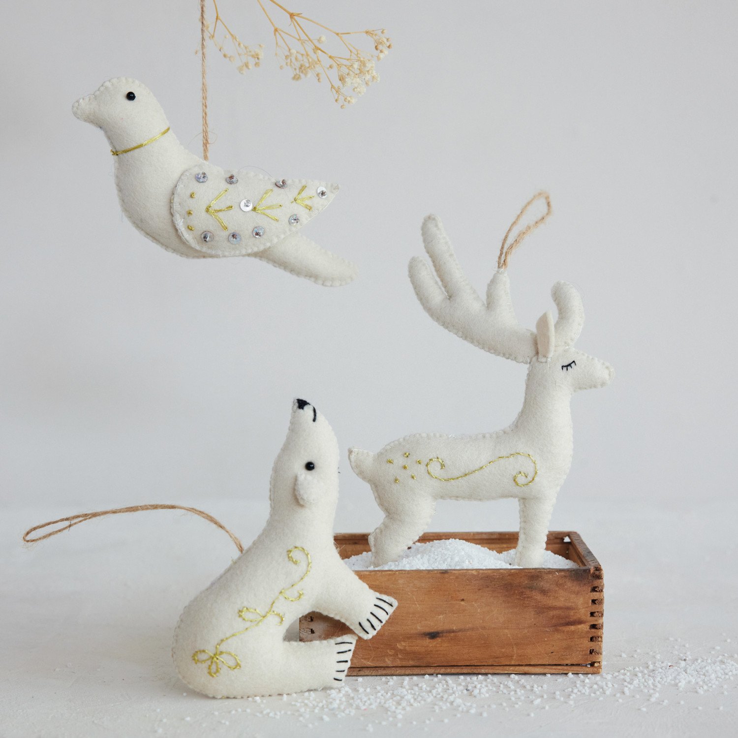 Catalog Name: 3-1/2"H - 5-1/2"H Handmade Wool Felt Animal Ornament w/ Metallic Gold Thread Embroidery, Sequins & Beads, Cream Color, 3 Styles