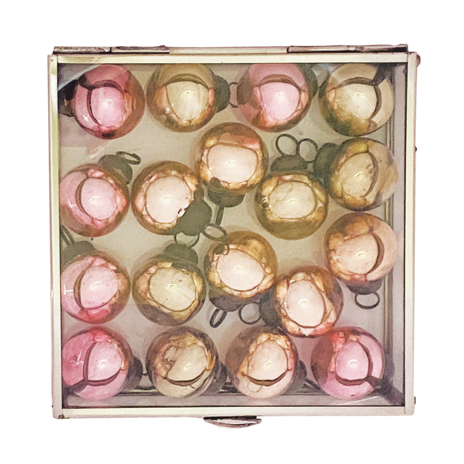Catalog Name: 1-1/4"H (18) Mercury Glass Ornaments in 6" Square x 1-3/4"H Stainless Steel & Glass Display Box, Nickel Finish, Copper Color, Green & Pink, Set of 19