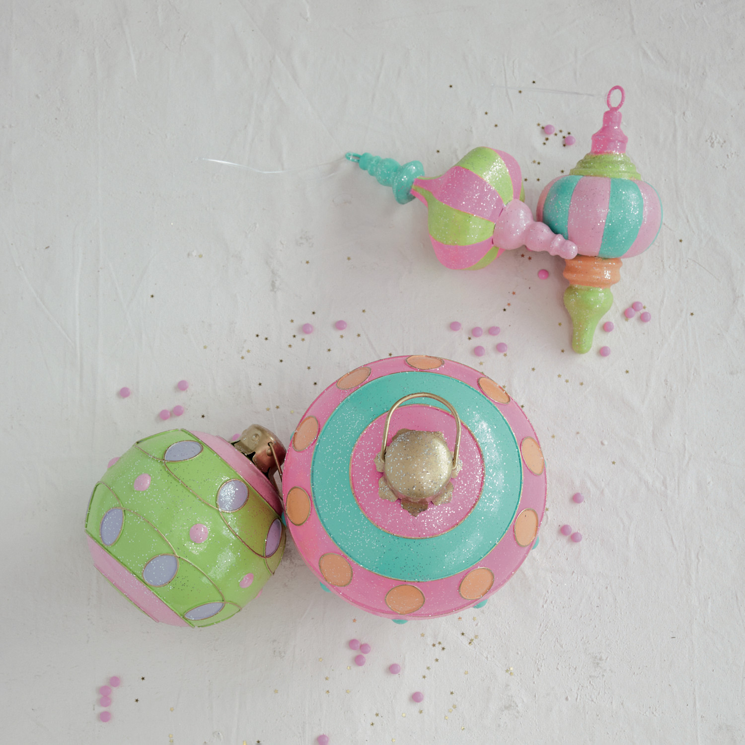 Oversized Painted Metal Ball Ornament with Pattern & Glitter, Green, Pink & Purple