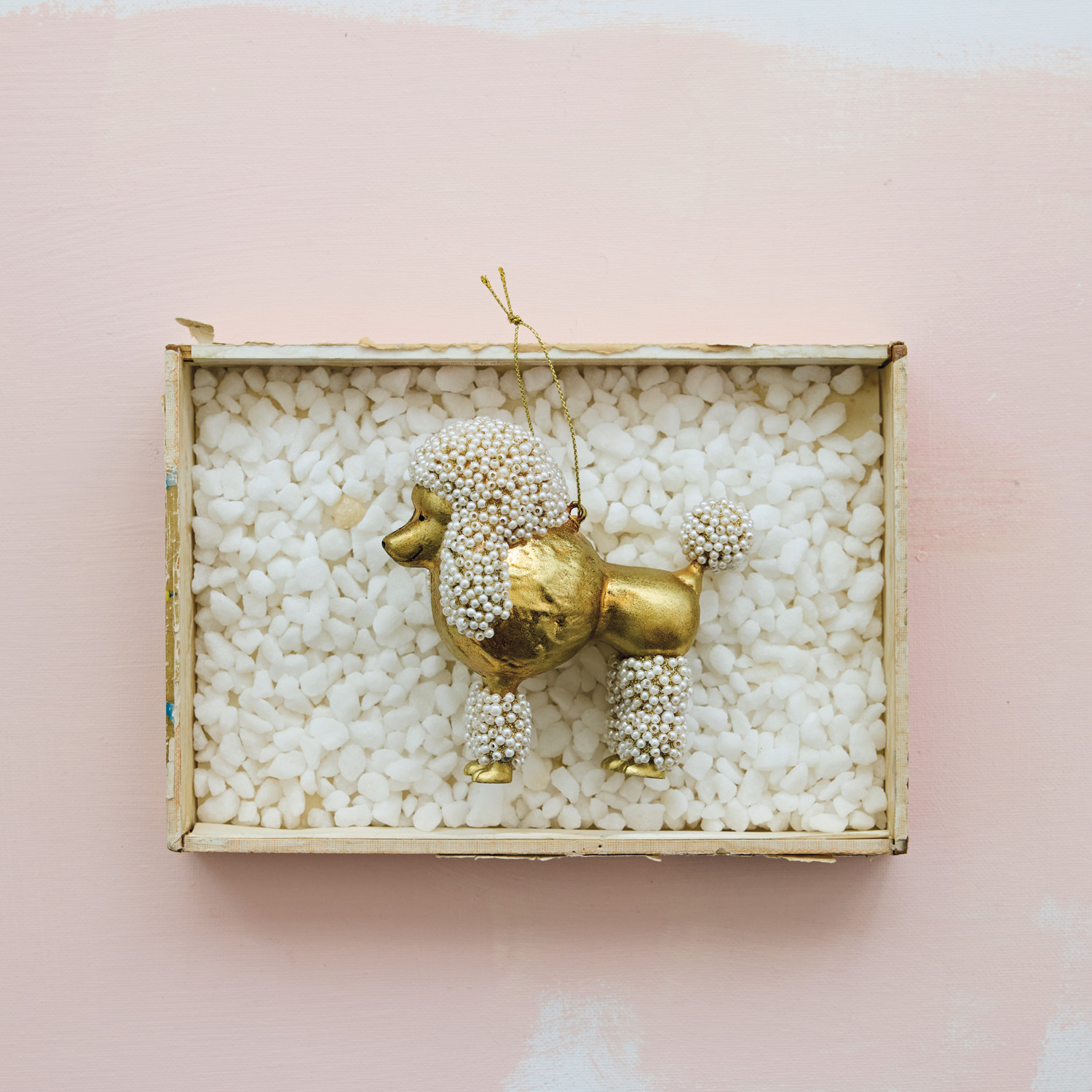 Glass Poodle Ornament with Faux Pearls, Gold Finish
