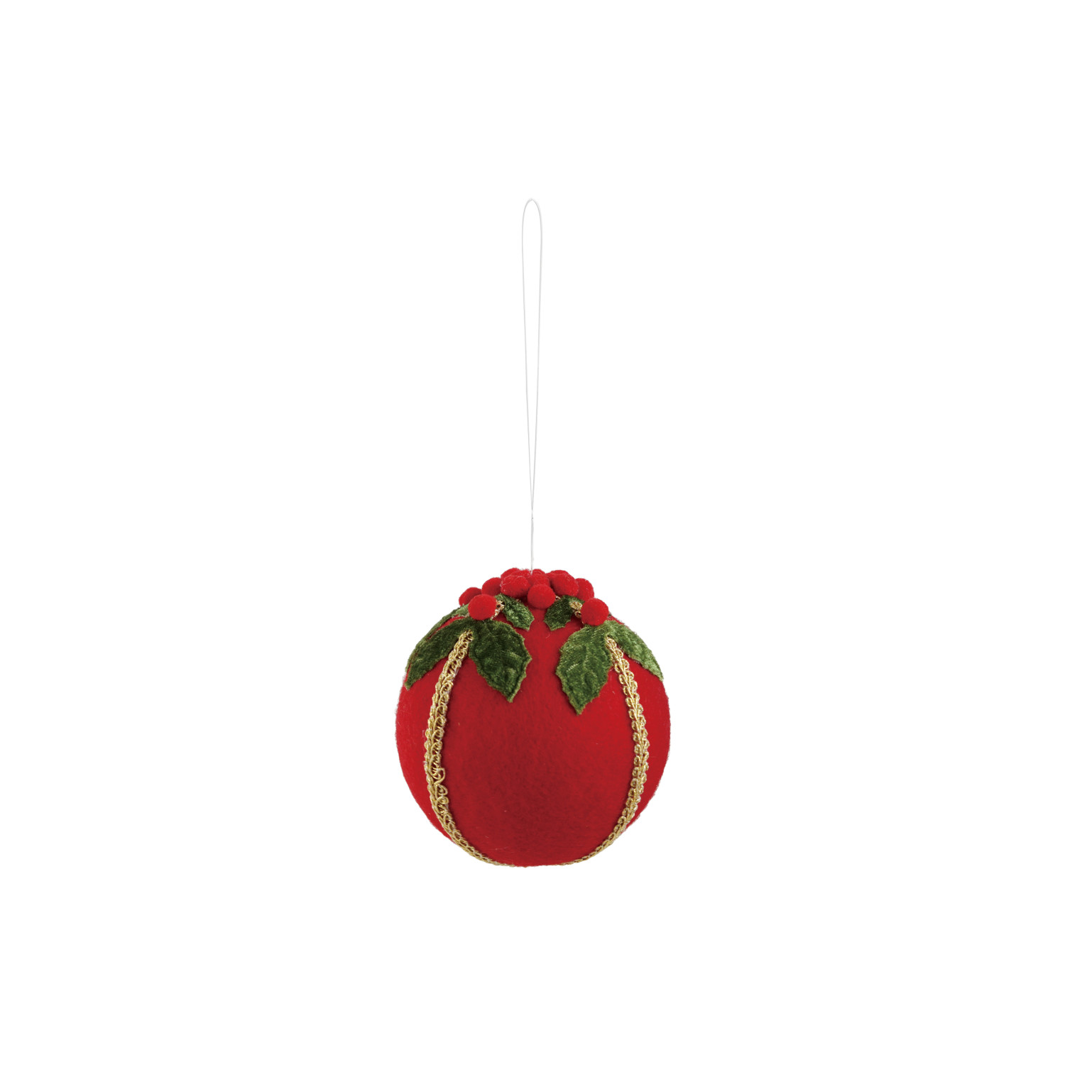 Fabric Felt Ball Ornament with Holly Leaves & Berries, Red, Green & Gold Finish