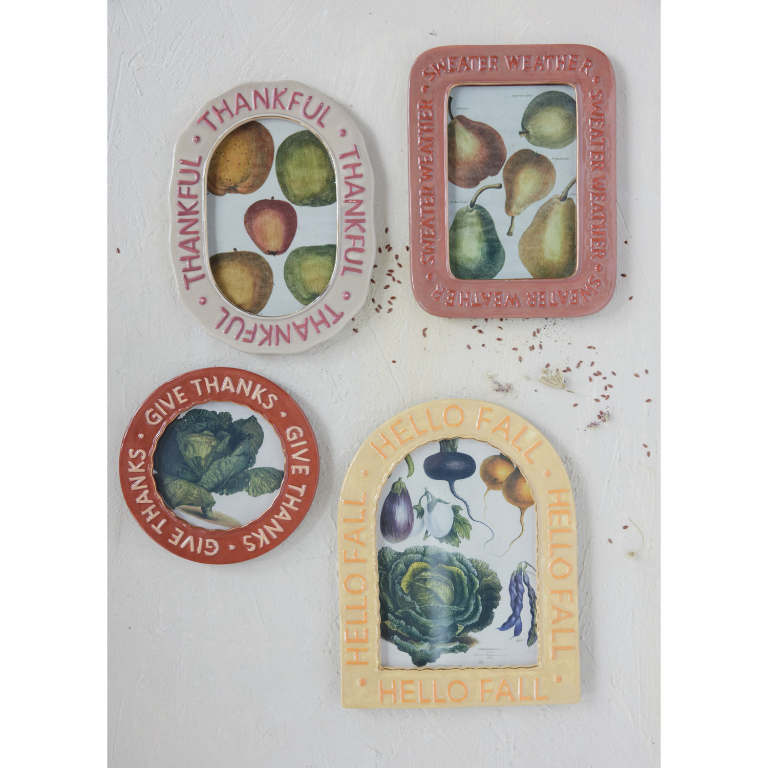 Catalog Name: 6"W x 8"H Oval Hand-Painted Embossed Stoneware Photo Frame "Thankful", Cream Color & Brown (Holds 4-1/4" x 6-1/4" Photo)
