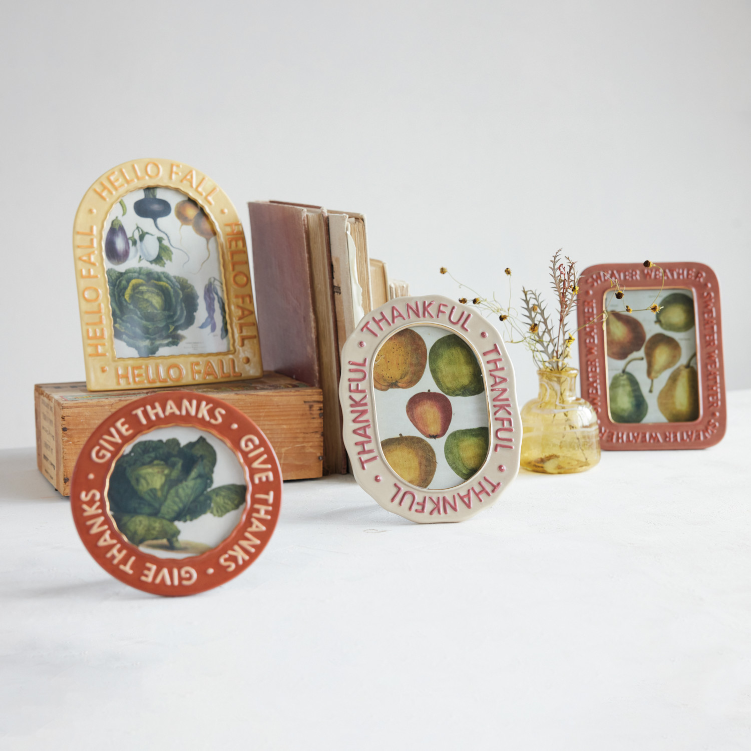 Catalog Name: 7-1/4"W x 9-1/4"H Hand-Painted Embossed Stoneware Arched Photo Frame "Hello Fall", Yellow & Orange Color (Holds 5" x 7" Photo)