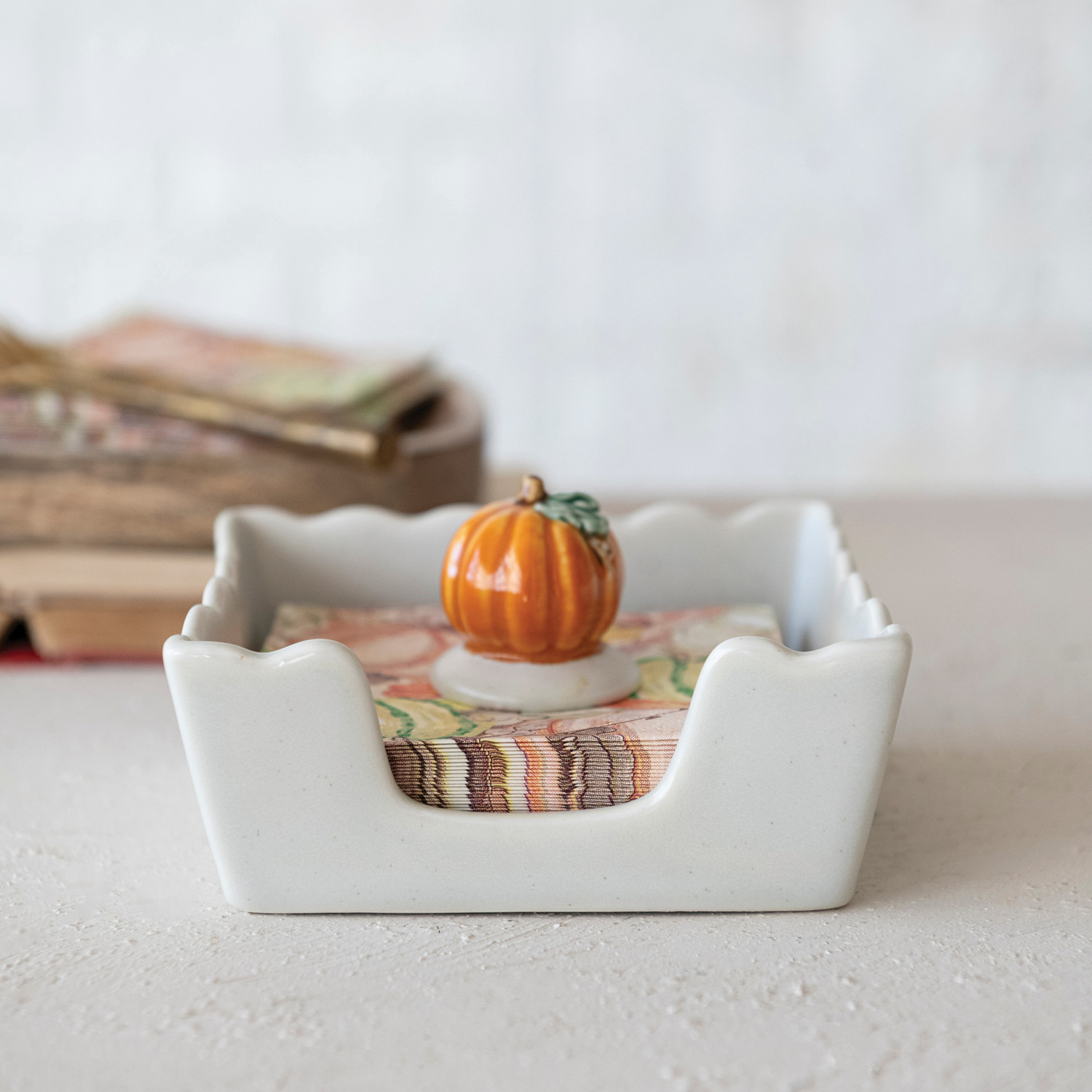 Catalog Name: 5-3/4" Square x 1-3/4"H Stoneware Scalloped Cocktail Napkin Holder w/ Pumpkin Shaped Weight, White, Orange Color & Green, Set of 2 (Holds 4" Square Napkin)
