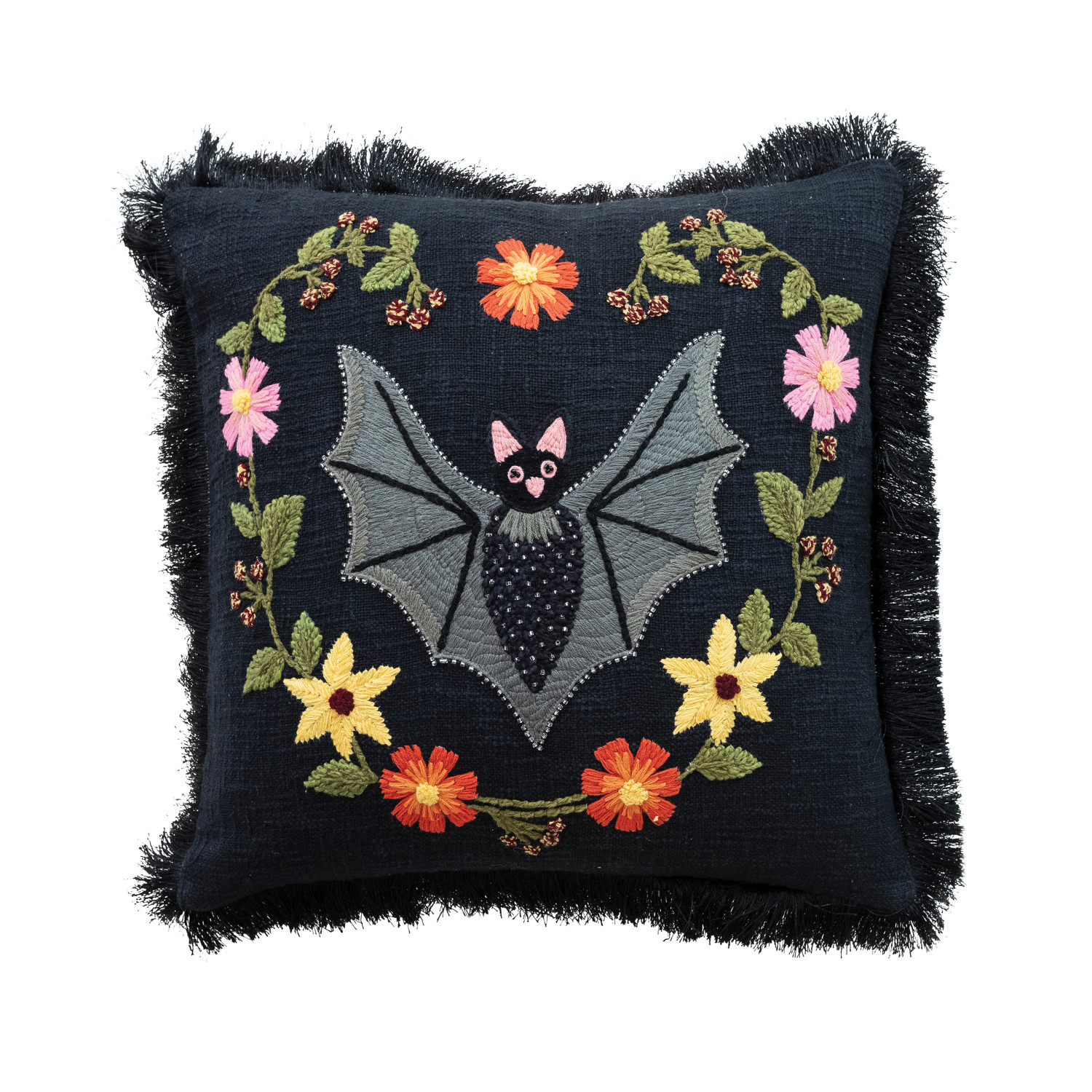 Catalog Name: 20" Square Cotton Slub Pillow w/ Bat, Heart Shaped Flowers, Embroidery, Beads & Eyelash Fringe, Multi Color