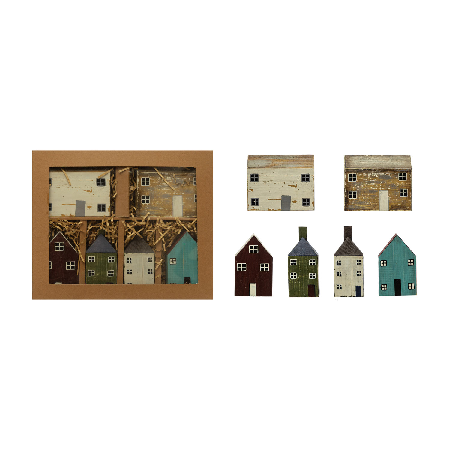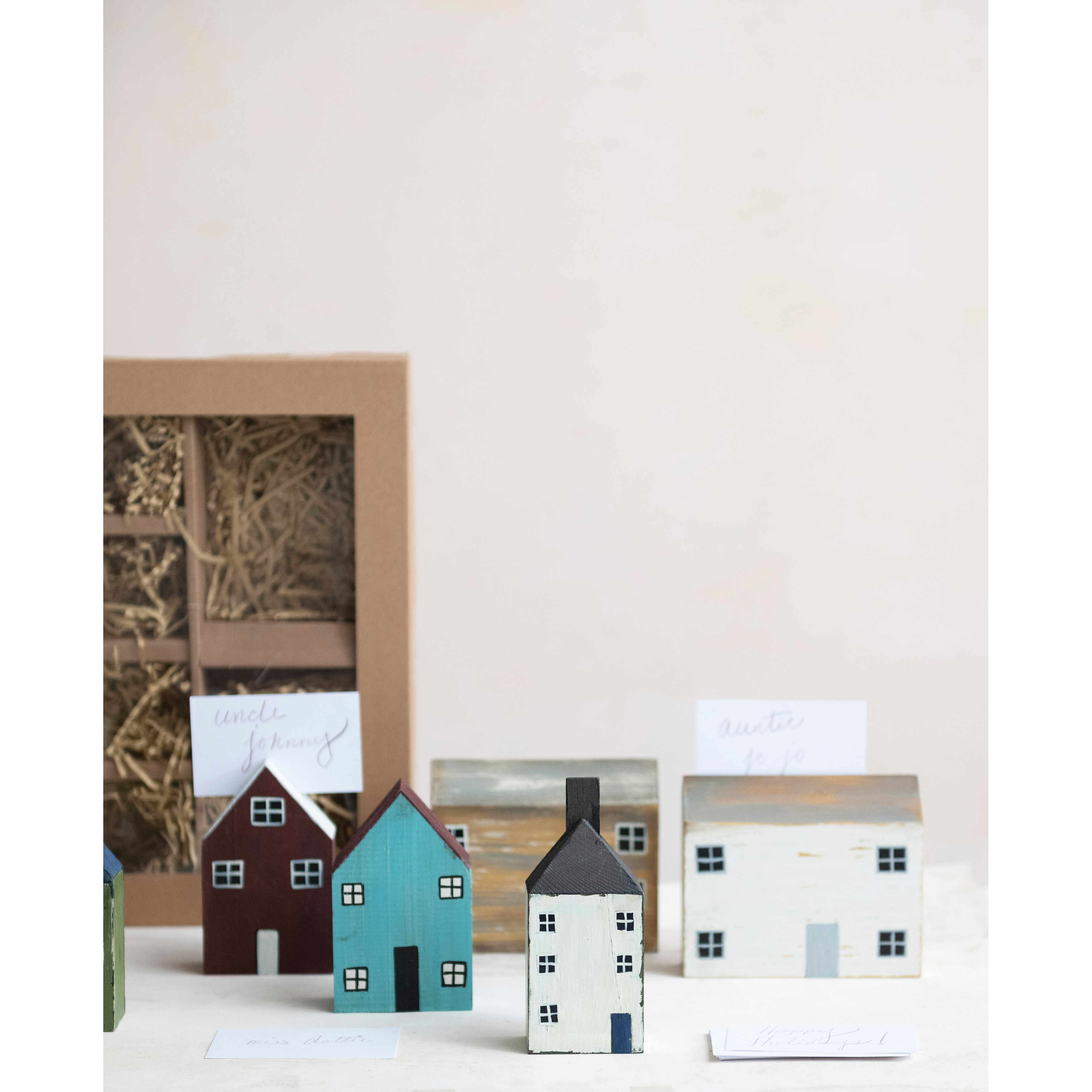 Catalog Name: 4"H - 5"H Hand-Painted Pine Wood House Place Card/Photo Holders with 12 Cards, Multi Color, Boxed Set of 6