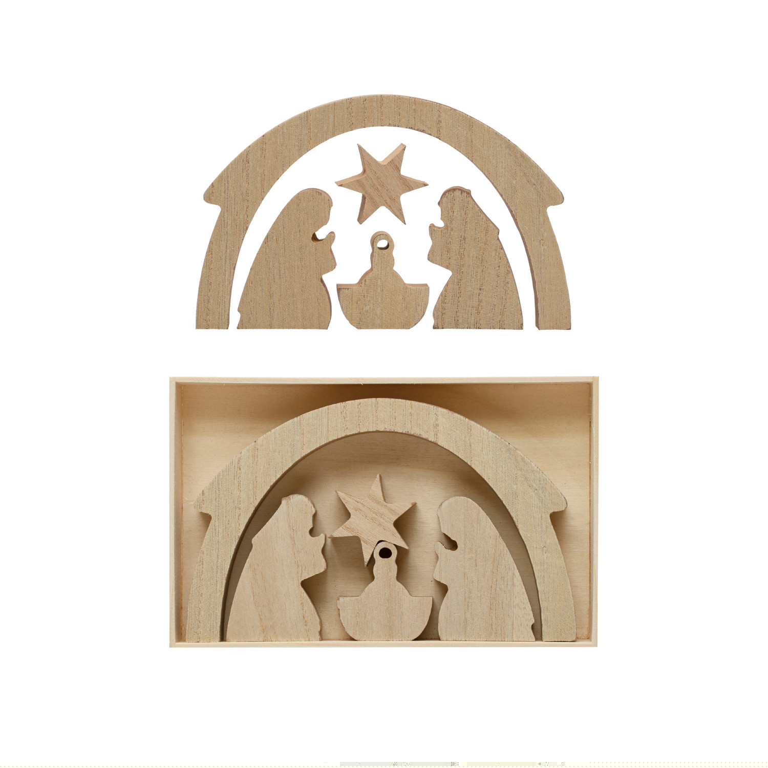 Catalog Name: 1-1/4"H - 4-1/2"H Wood Nativity, Natural, Boxed Set of 5