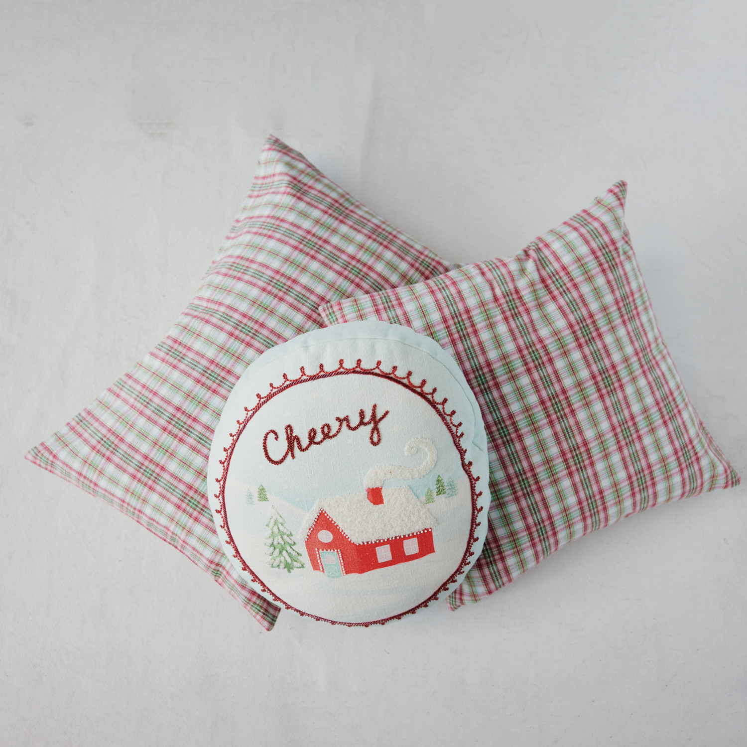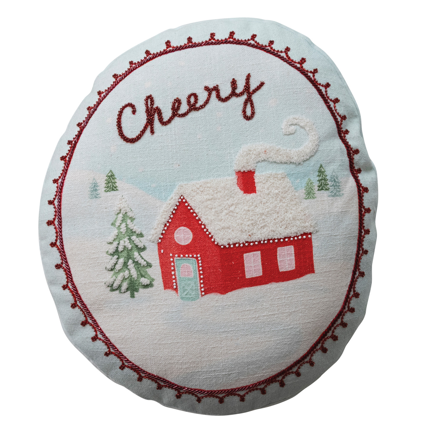 Catalog Name: 16"L x 12"W Oval Cotton Slub Pillow w/ House, Embroidery, Beads & Velvet Back "Cheery", Multi Color ©