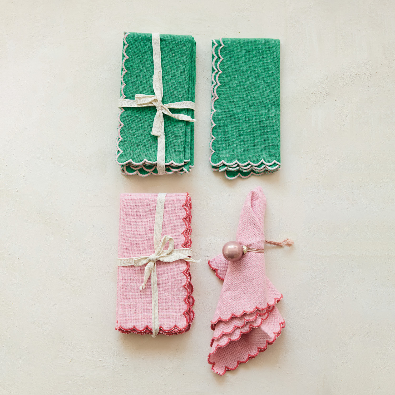 Catalog Name: 18" Square Cotton Scalloped Napkins w/ Contrasting Stitched Edges, Green & Pink, Set of 4 Tied w/ Cotton Tape