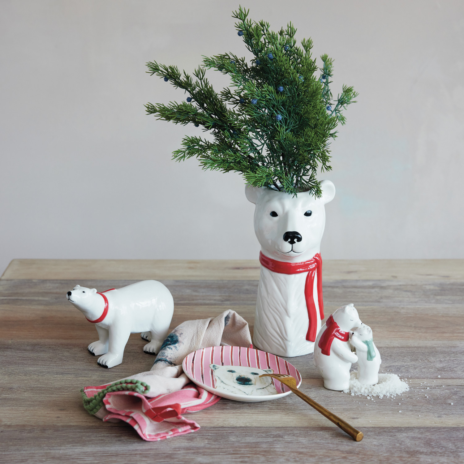 Stoneware Polar Bear with Scarf, Cub & Owl, White, Red & Black