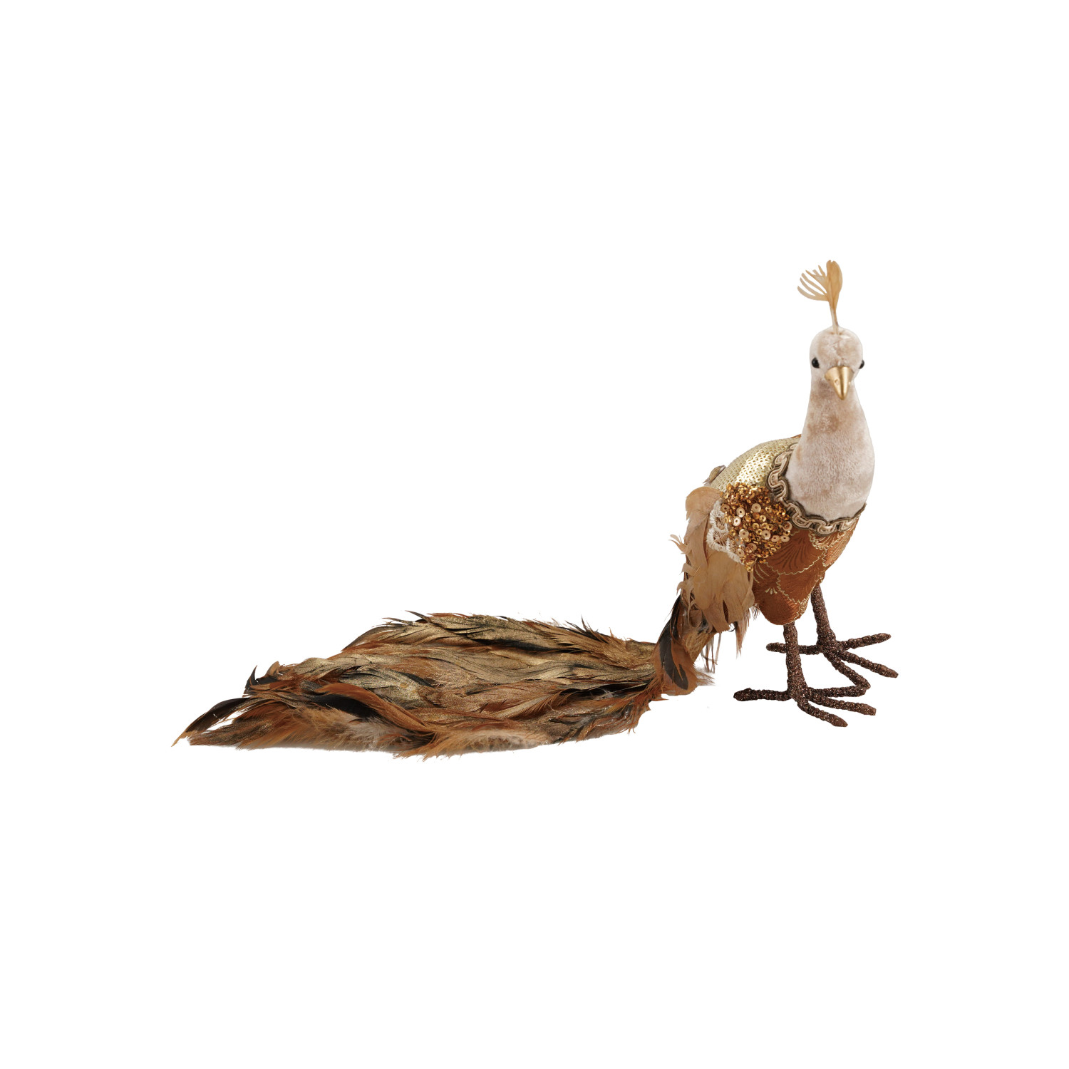 Catalog Name: 9-1/2"L x 4-3/4"W x 10"H Foam & Fabric Peacock w/ Sequins & Feathers, Brown