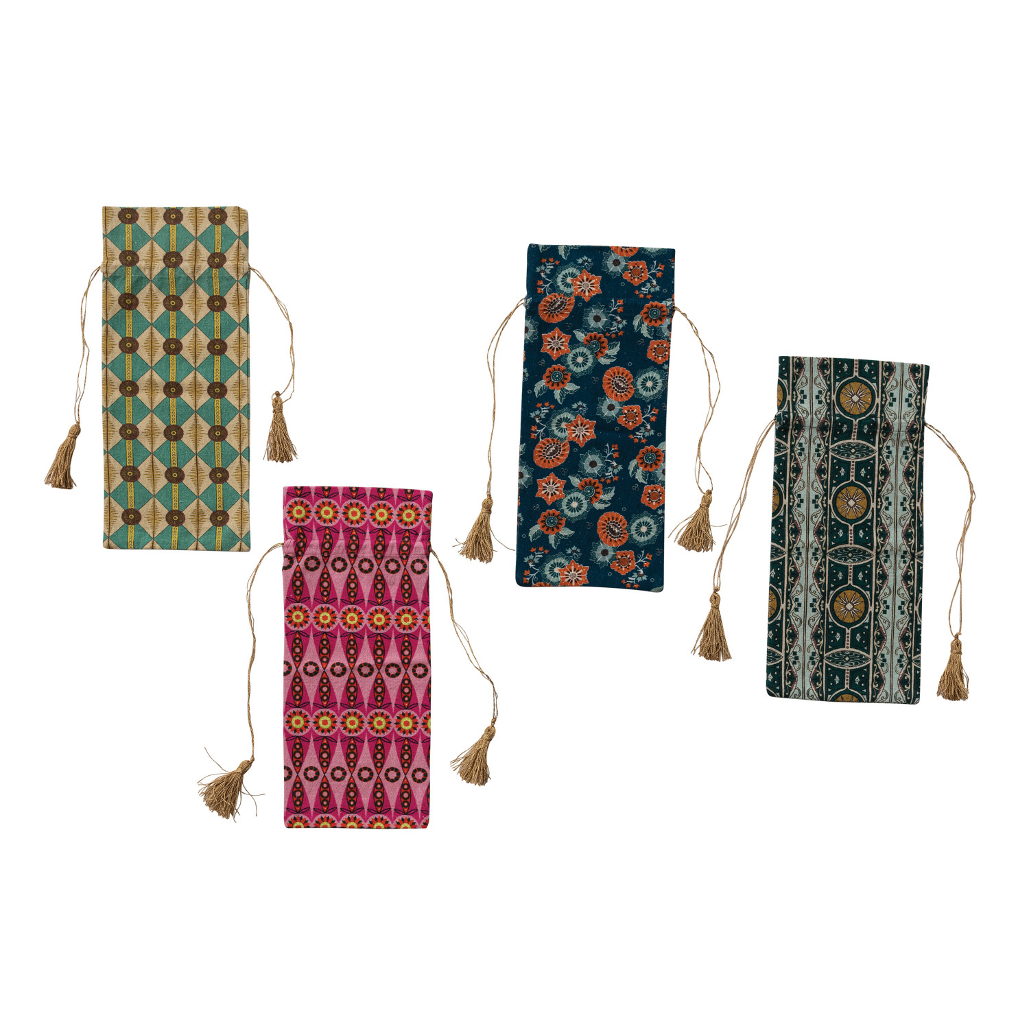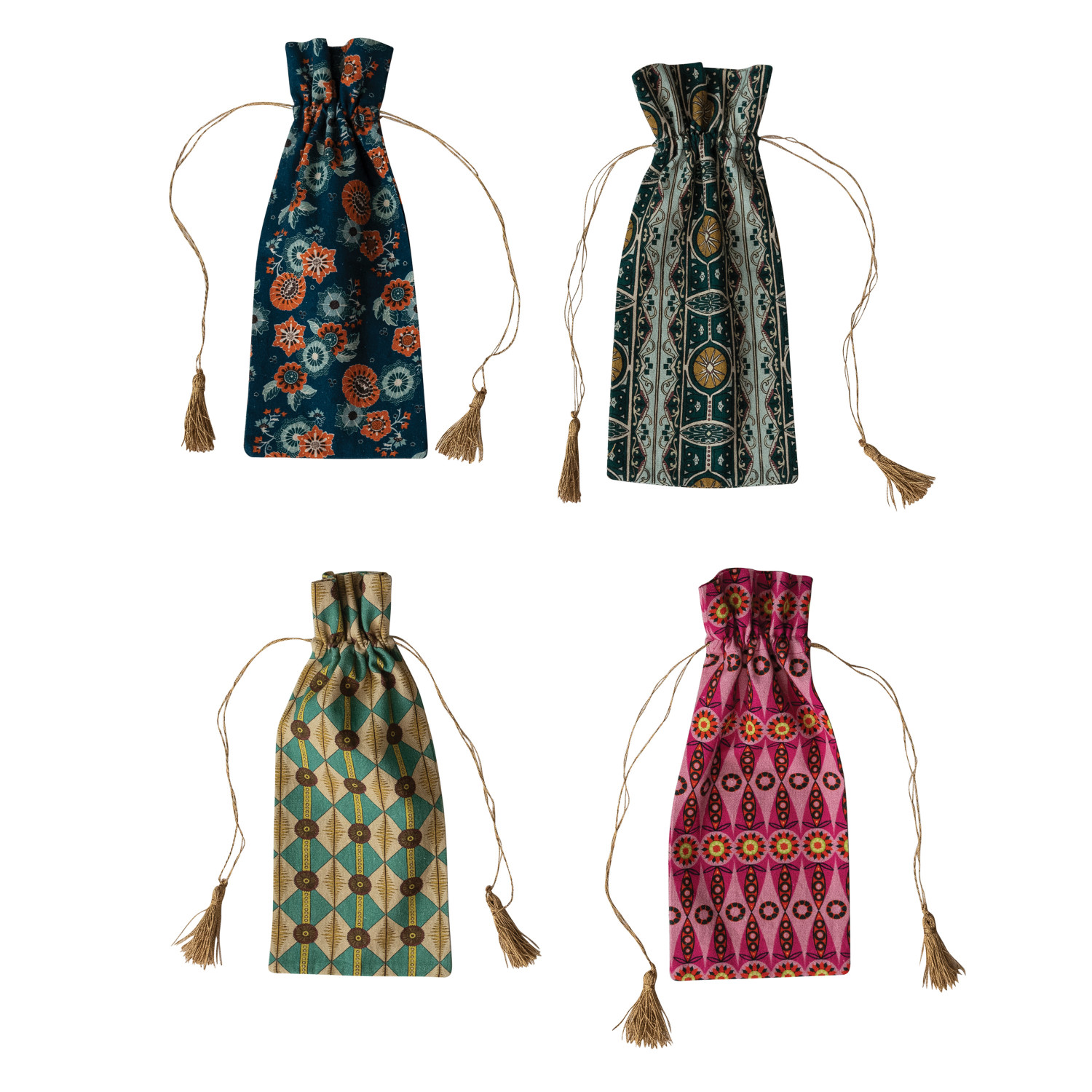 Catalog Name: 14"L x 6"W Cotton & Linen Printed Drawstring Wine Bag w/ Pattern, Gold Tie & Tassels, Multi Color, 4 Styles ©
