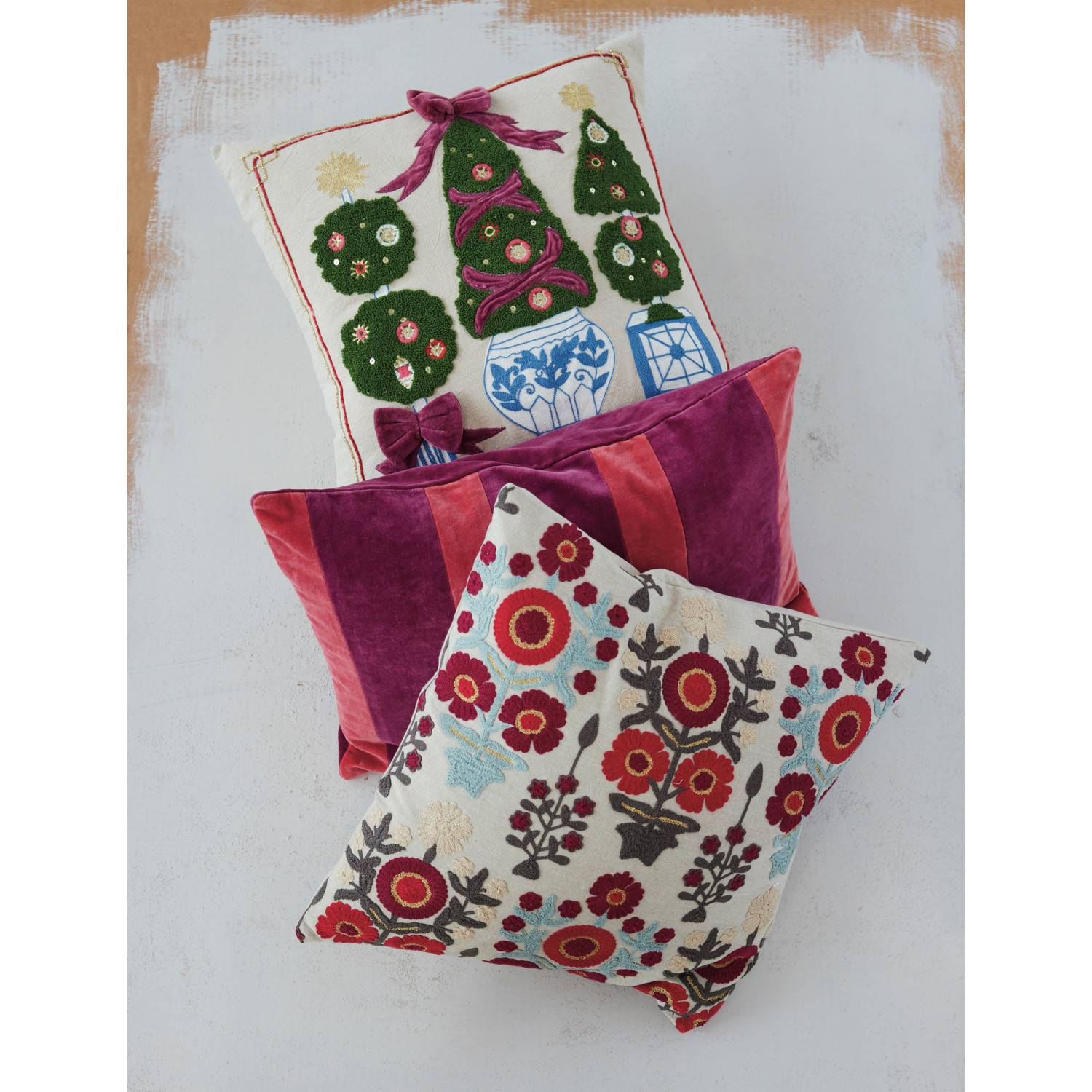 Catalog Name: 18" Square Cotton Chambray Pillow w/ Topiaries, Embroidery & Appliqued Velvet Bows, Multi Color