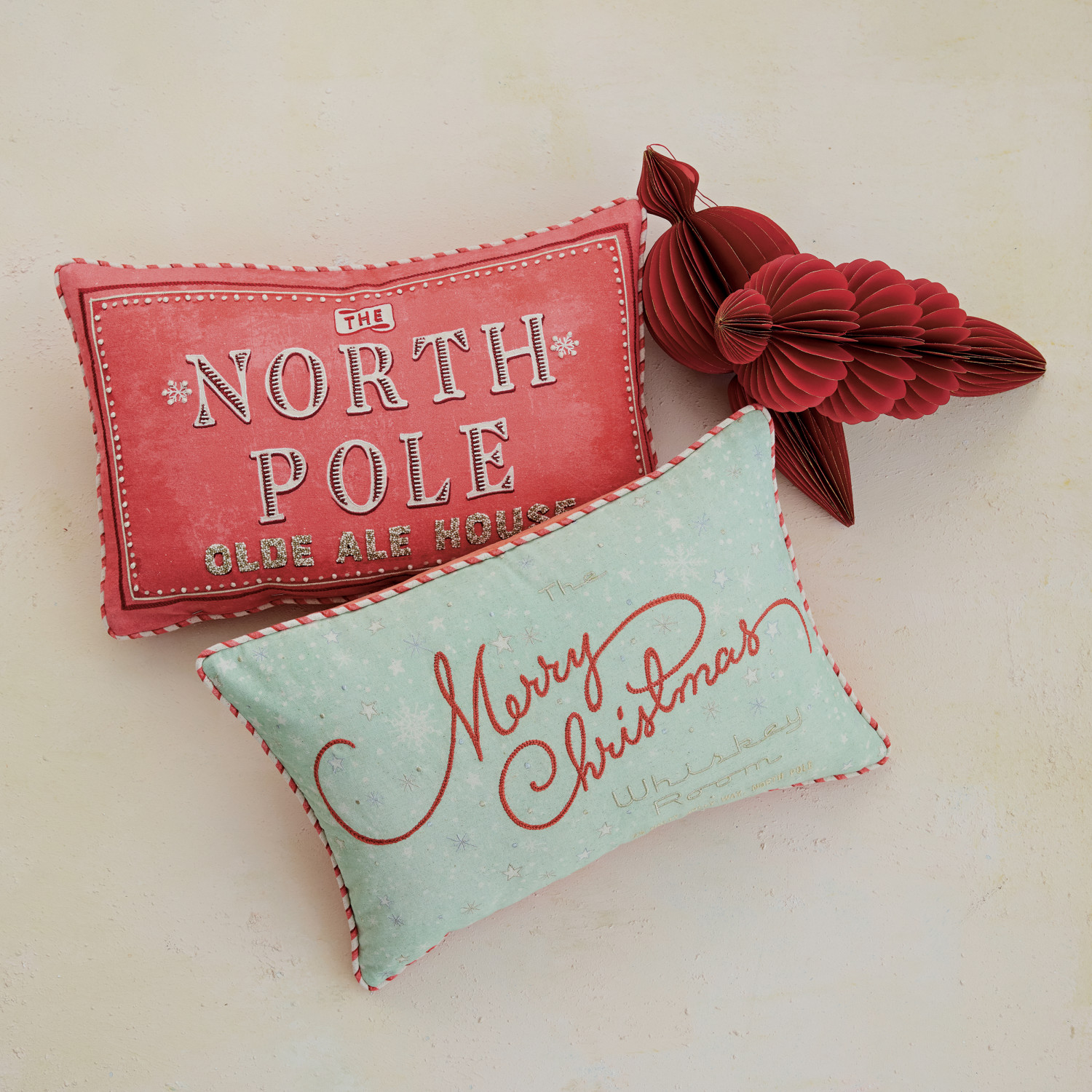 Catalog Name: 24"L x 16"H Cotton Printed Lumbar Pillow w/ Metallic Silver Thread, Embroidery, Beads, Striped Piping & Velvet Back "The North Pole…", Red, Silver & Cream Color ©