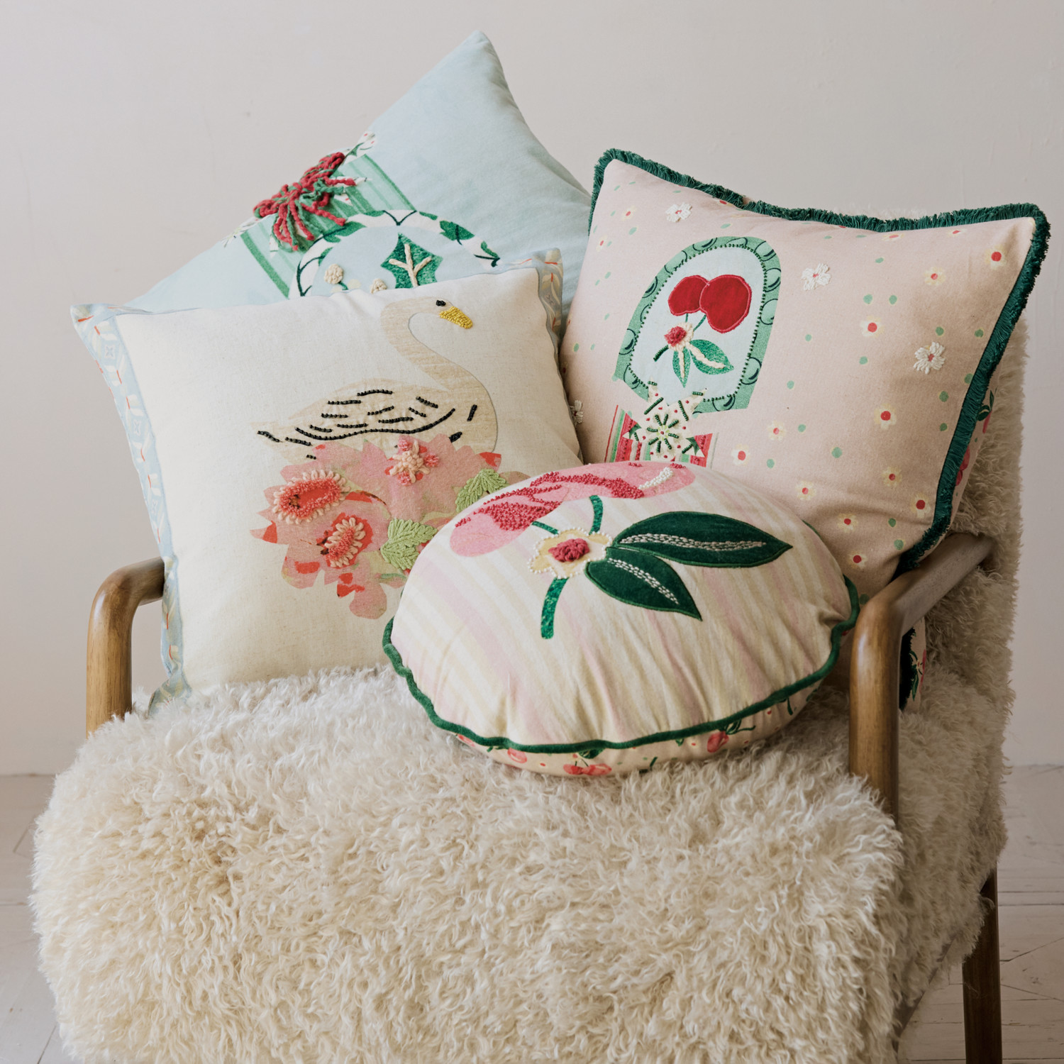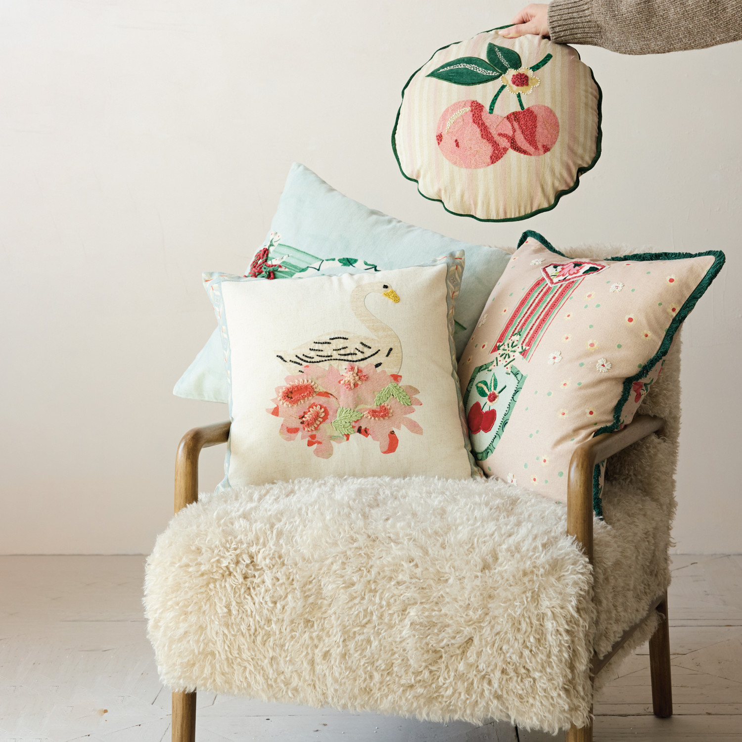 Catalog Name: 18" Square Cotton & Linen Printed Pillow w/ Swan, Flowers, Embroidery, Beads & Striped Patterned Back, Multi Color ©
