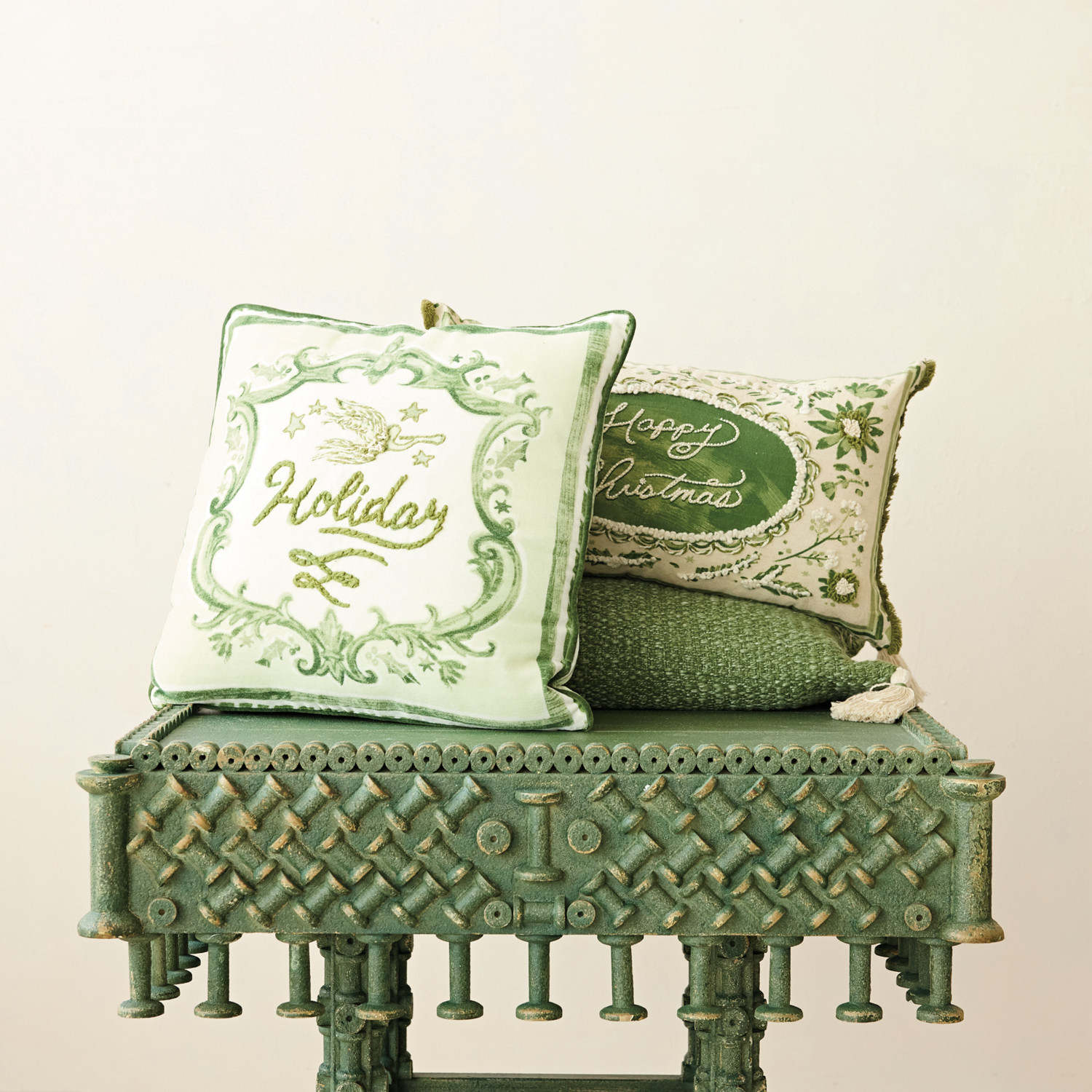 Catalog Name: 20" Square Cotton Printed Pillow w/ Angel, Stars, Embroidery, Piping & Cotton Velvet Striped Back "Holiday", Green & Cream Color ©