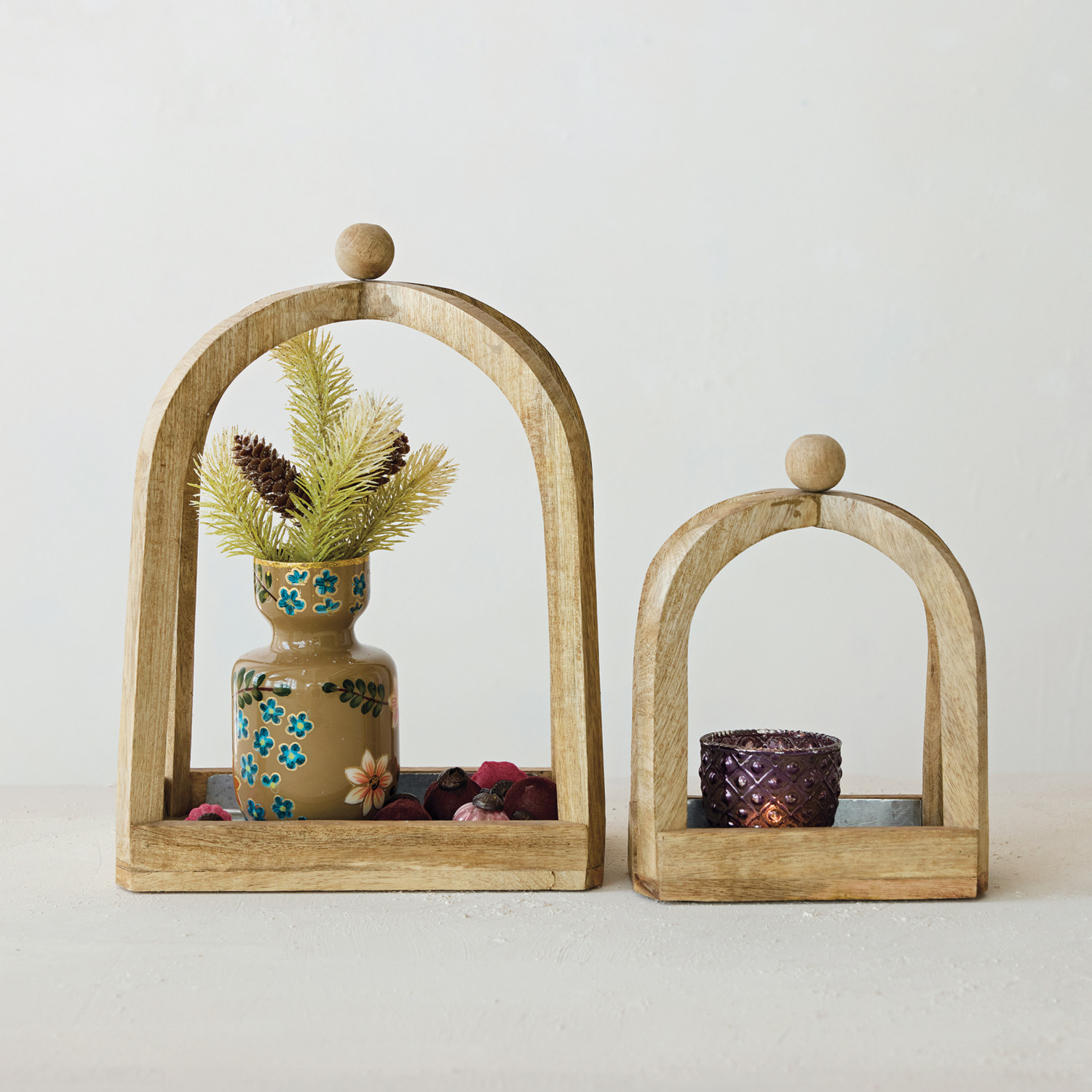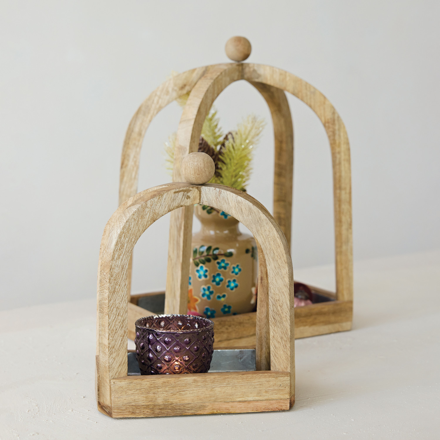 Mango Wood Arched Table Top Decor with Metal Lined Base & Knob Handles, Natural, Set of 2