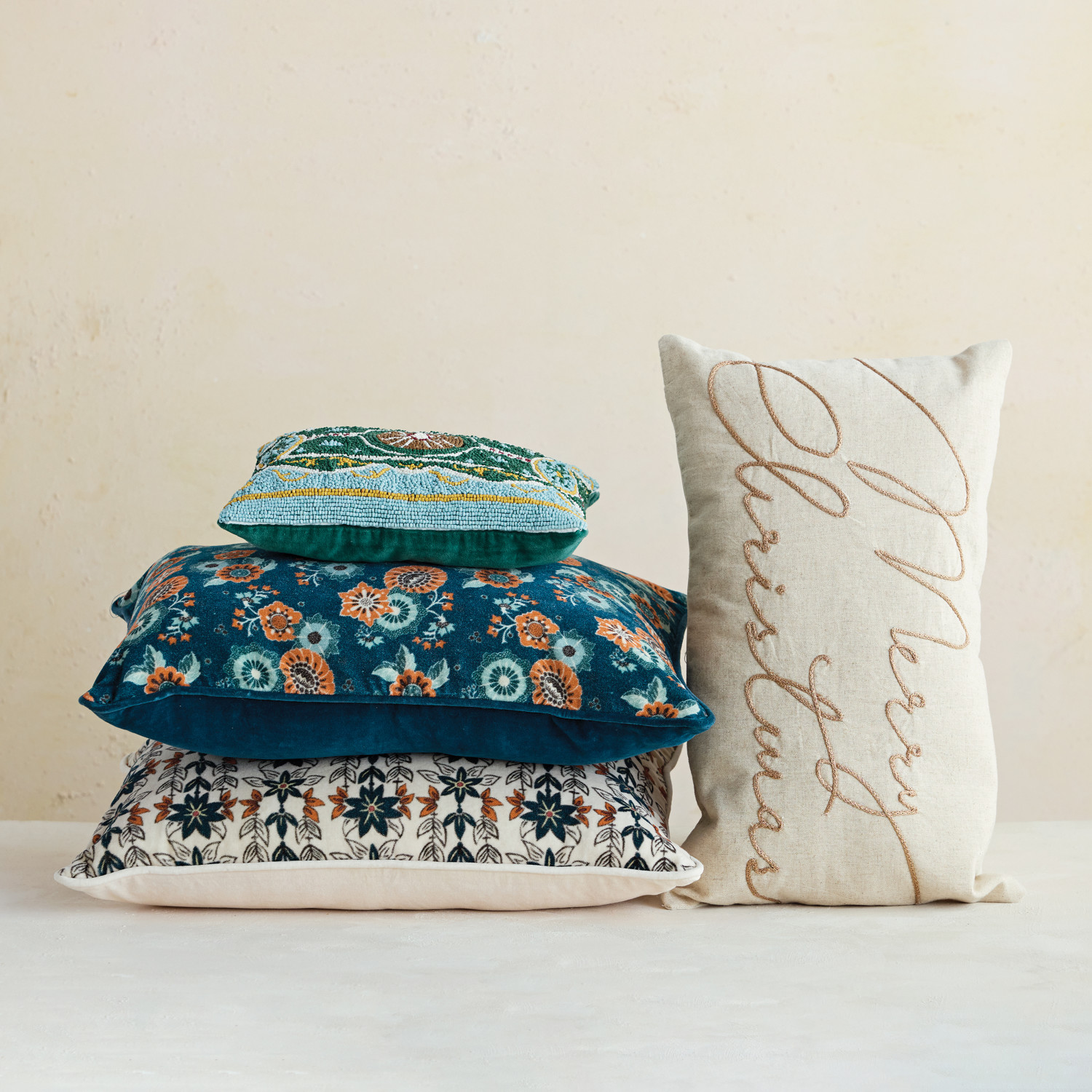 Cotton & Linen Lumbar Pillow with Embroidered "Merry Christmas", Natural & Copper Color