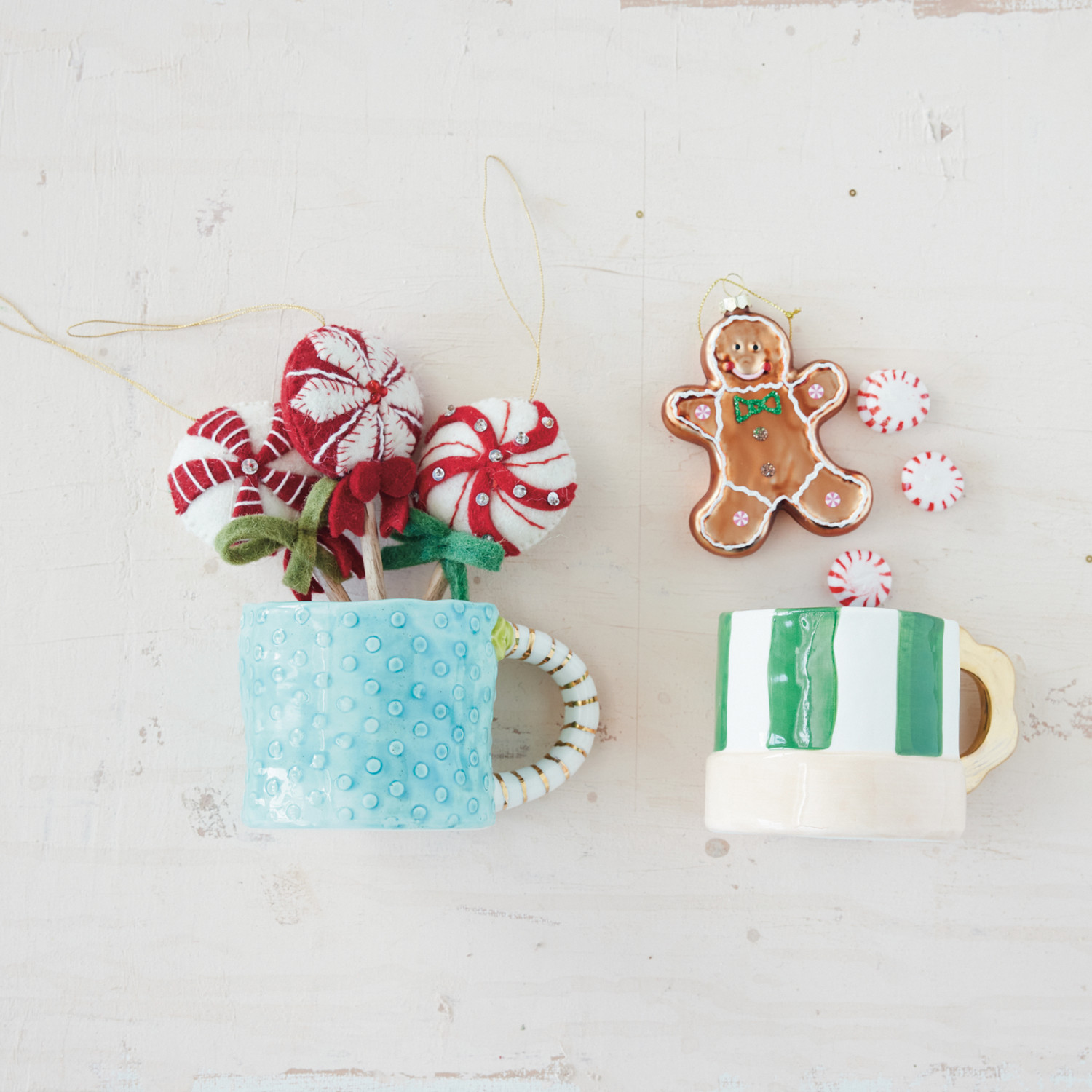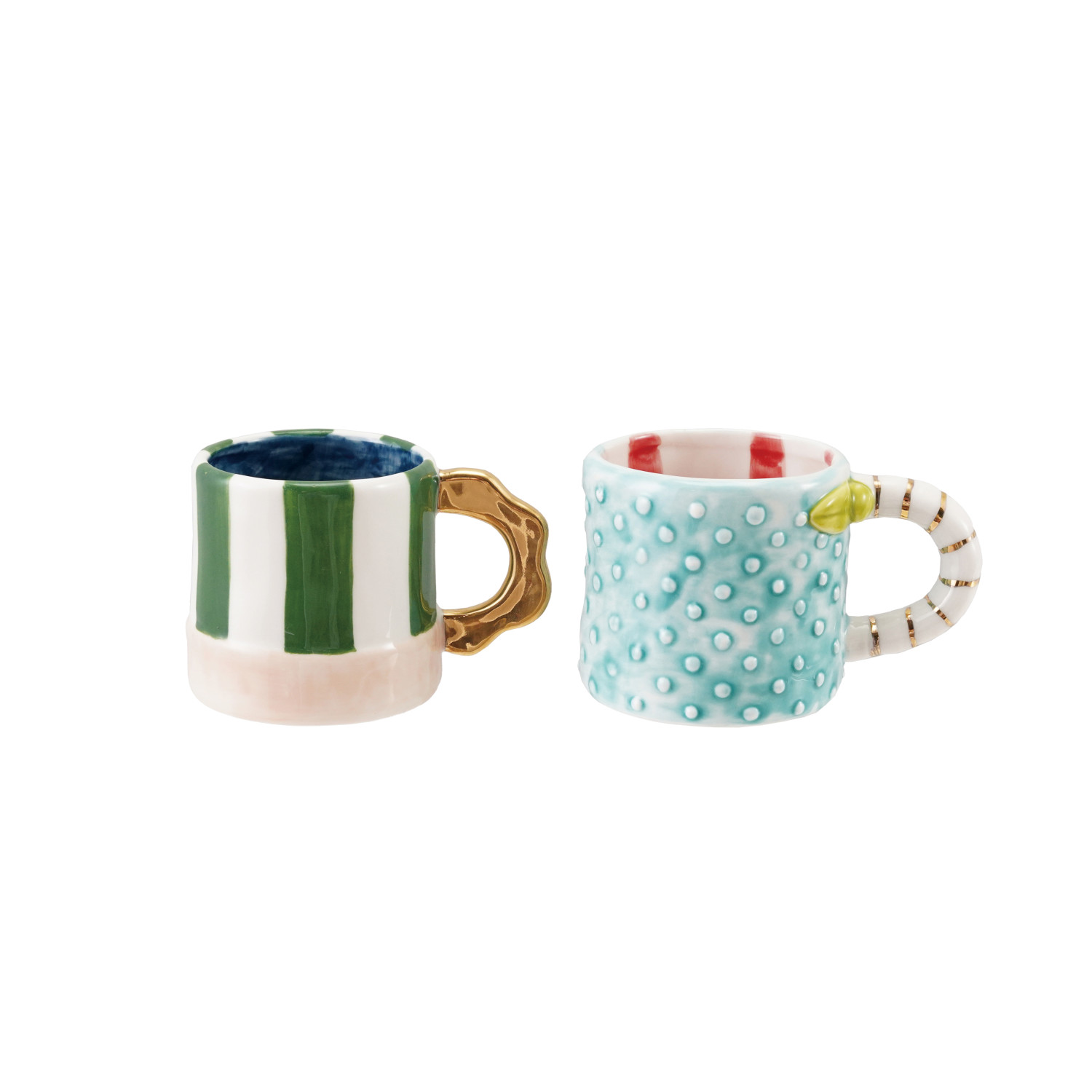 Catalog Name: 3-1/2" Round x 3"H 14 oz. Hand-Painted Stoneware Mug w/ Shaped Handle & Gold Electroplating, Multi Color, 2 Styles ©
