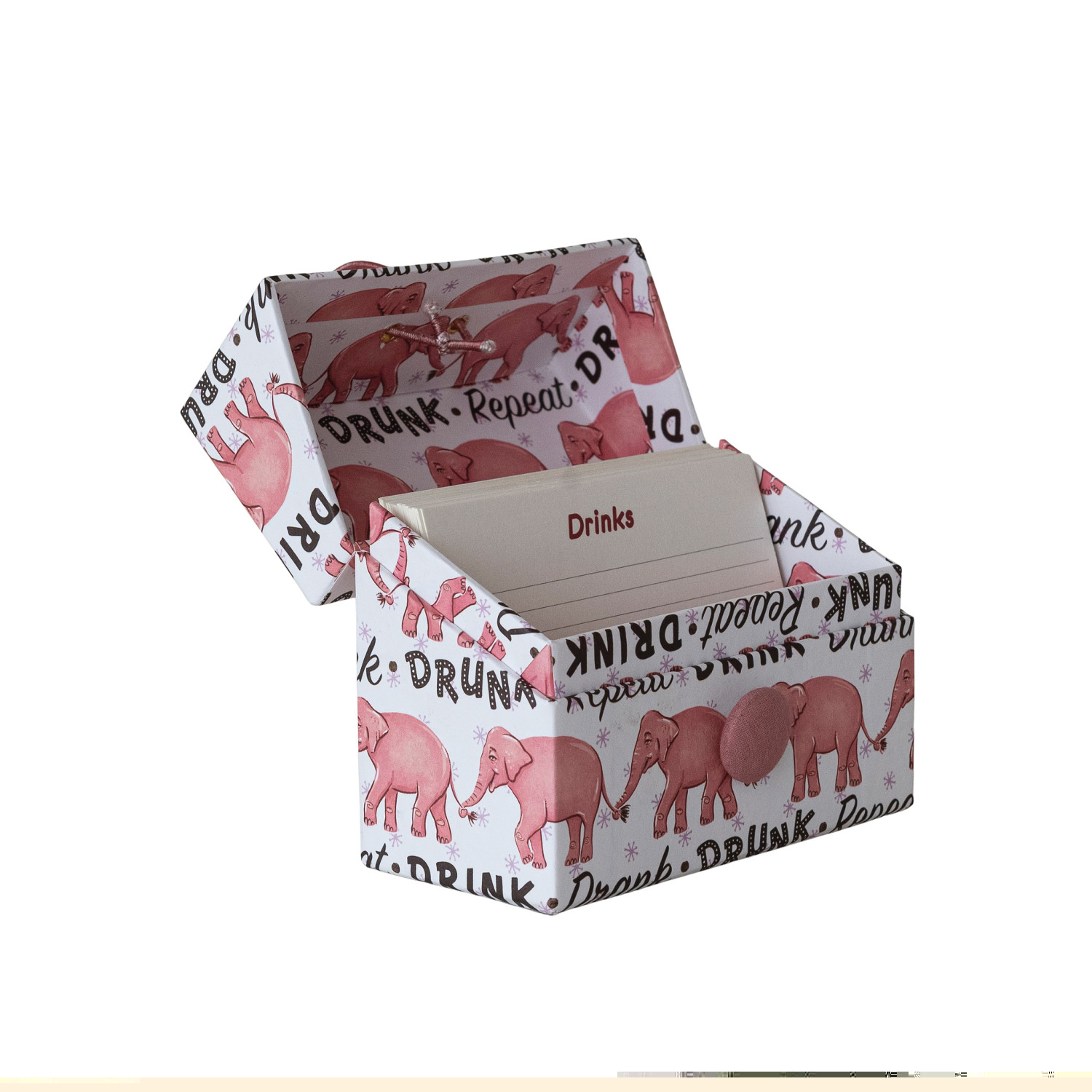 Catalog Name: 5-1/2"L x 2-3/4"W x 4"H Handmade Printed Recycled Paper Recipe Box w/ 36 Recipe Cards, Pink Elephants Pattern & Pink Button Closure, Multi Color, Set of 37 ©