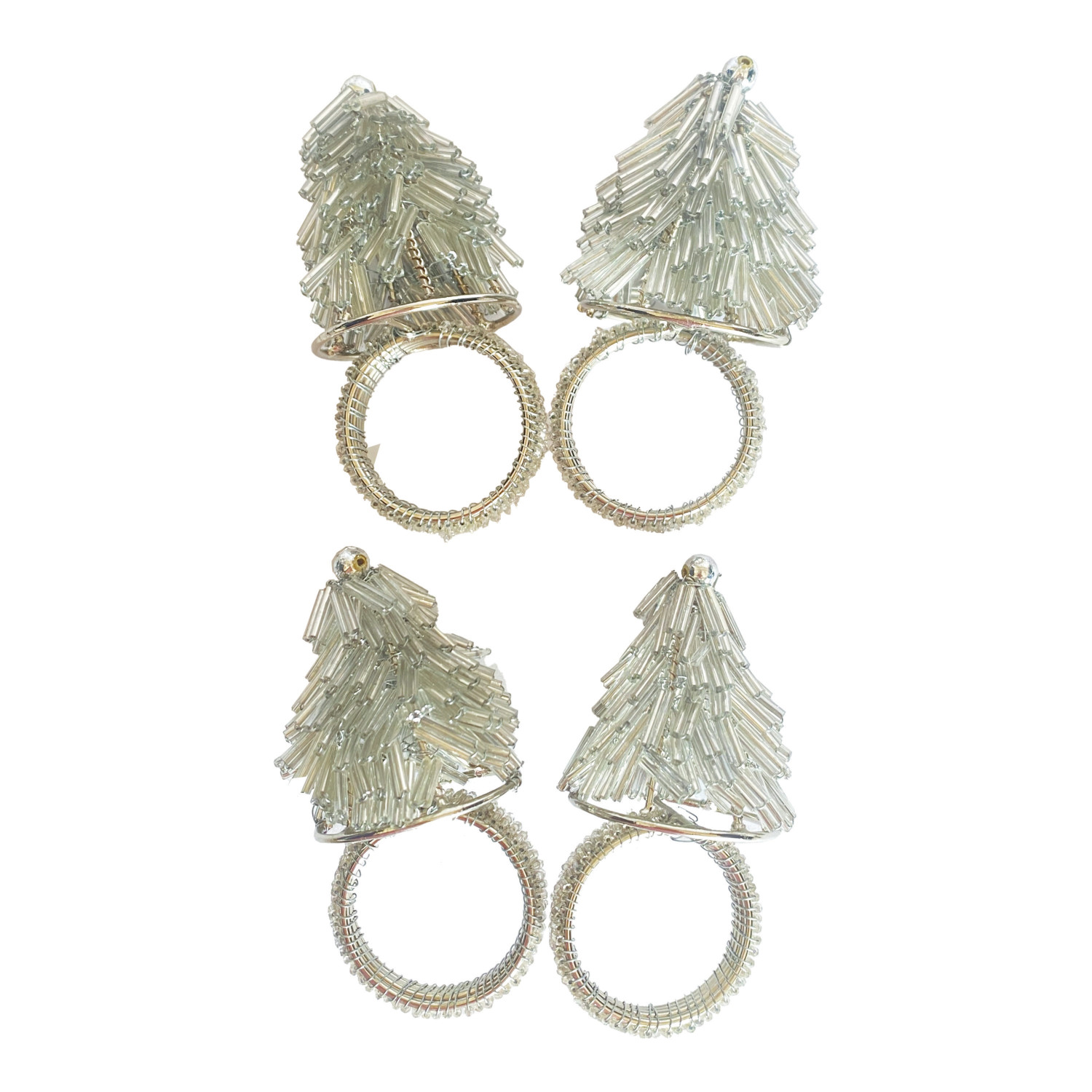 Catalog Name: 2" Round x 4"H Handmade Metal & Glass Beaded Tree Napkin Rings, Silver Finish, Set of 4 Tied w/ Jute