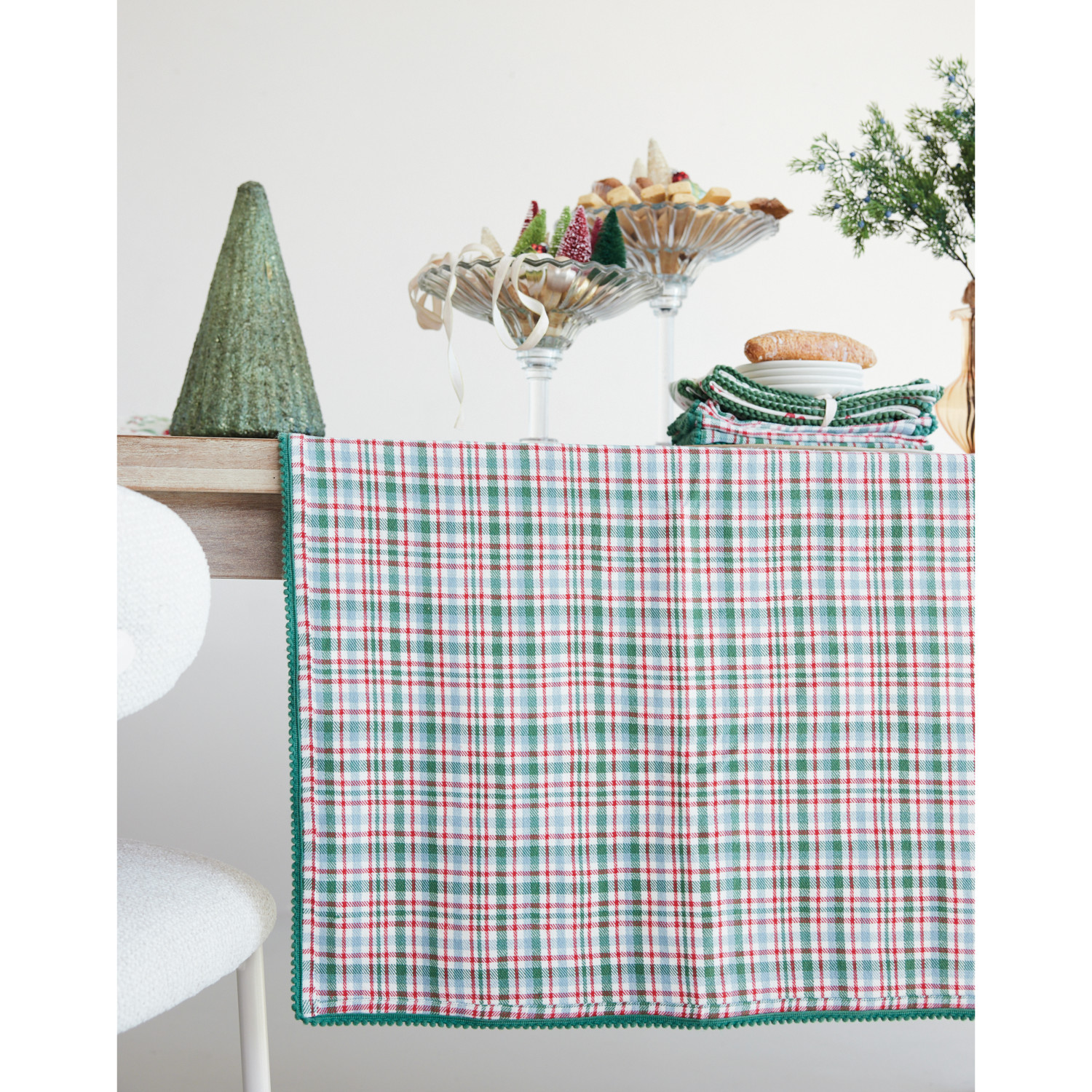 84"L x 60"W Woven Cotton Table Cloth with Plaid Pattern & Mini Pom Pom Trim