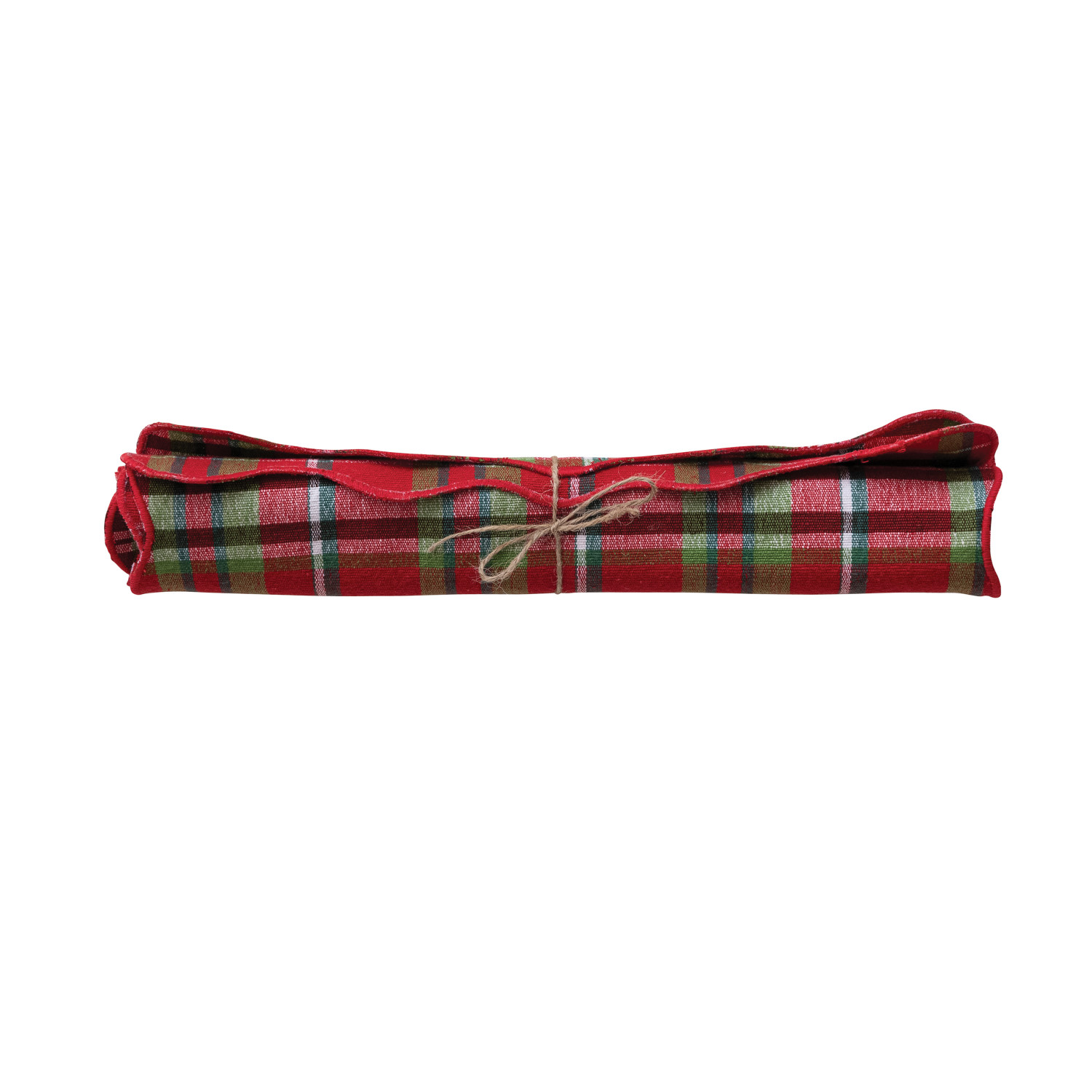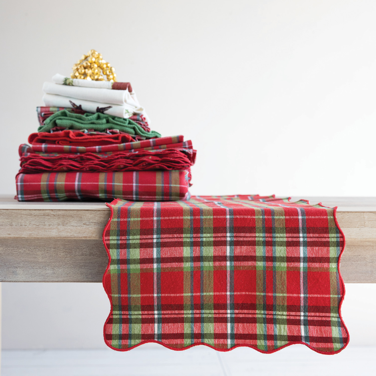 Catalog Name: 36"L x 14"W Cotton Scalloped Table Runner w/ Tartan Plaid Pattern & Stitched Edge, Multi Color, Roll Tied w/ Green Cotton Tape