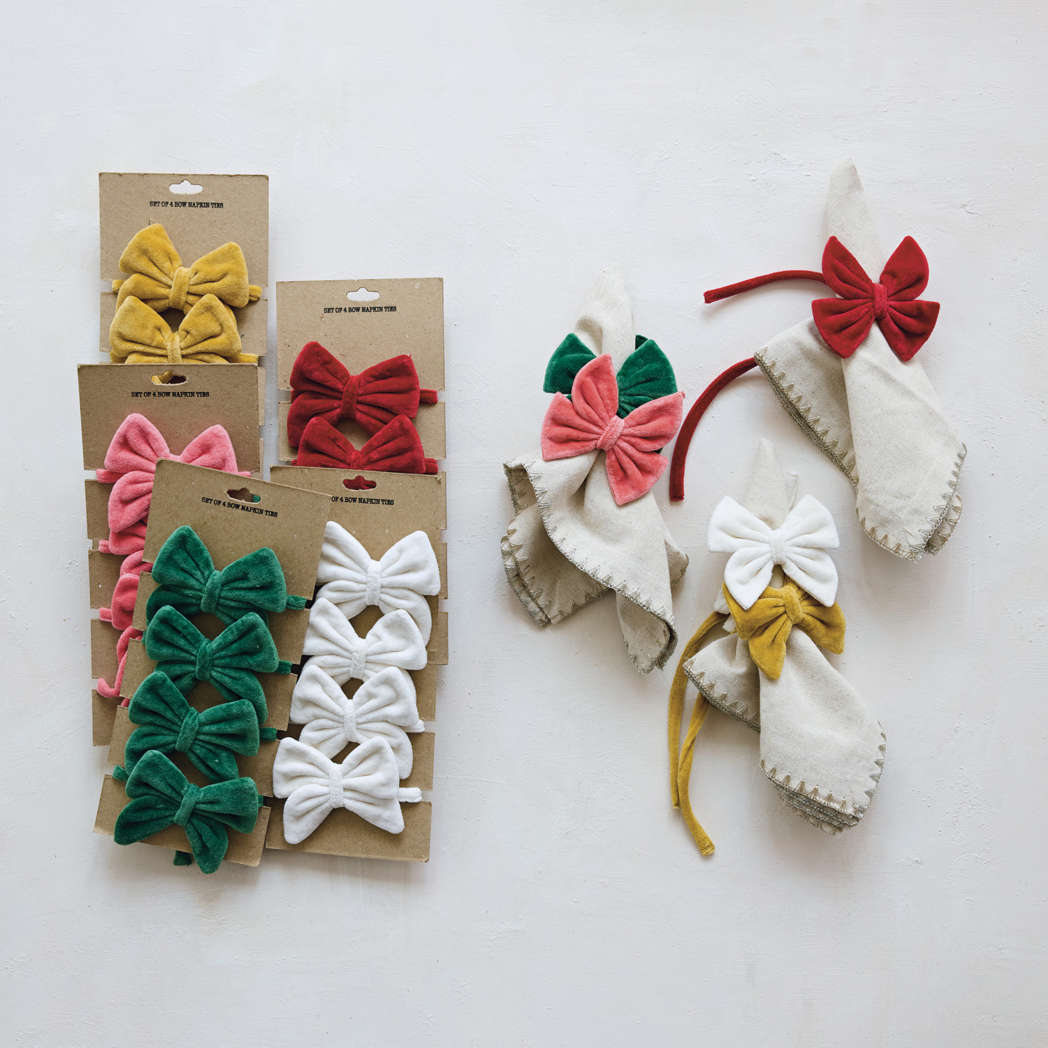 Cotton Velvet Bow Napkin Ties, Pink, Set of 4 on Card