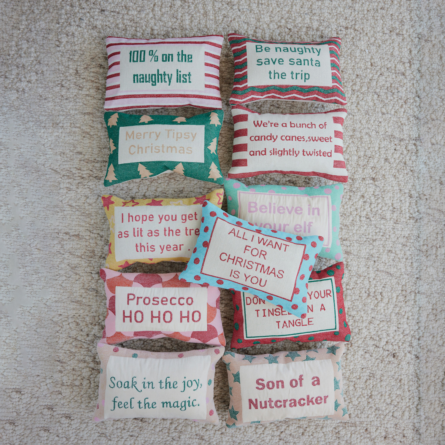 Cotton Embroidered Lumbar Pillow with Zig Zag Pattern "Be Naughty Save Santa..."
