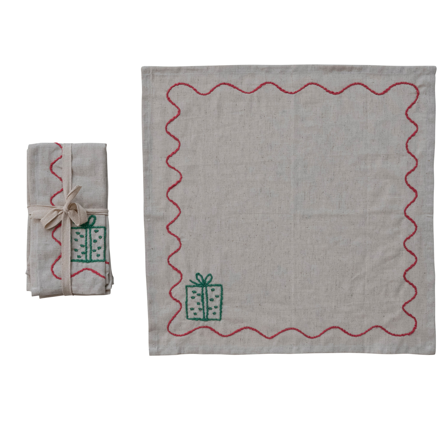 Catalog Name: 18" Square Cotton & Linen Napkins w/ Embroidered Gift Box & Scalloped Border, Set of 4 Tied w/ Cotton Tape