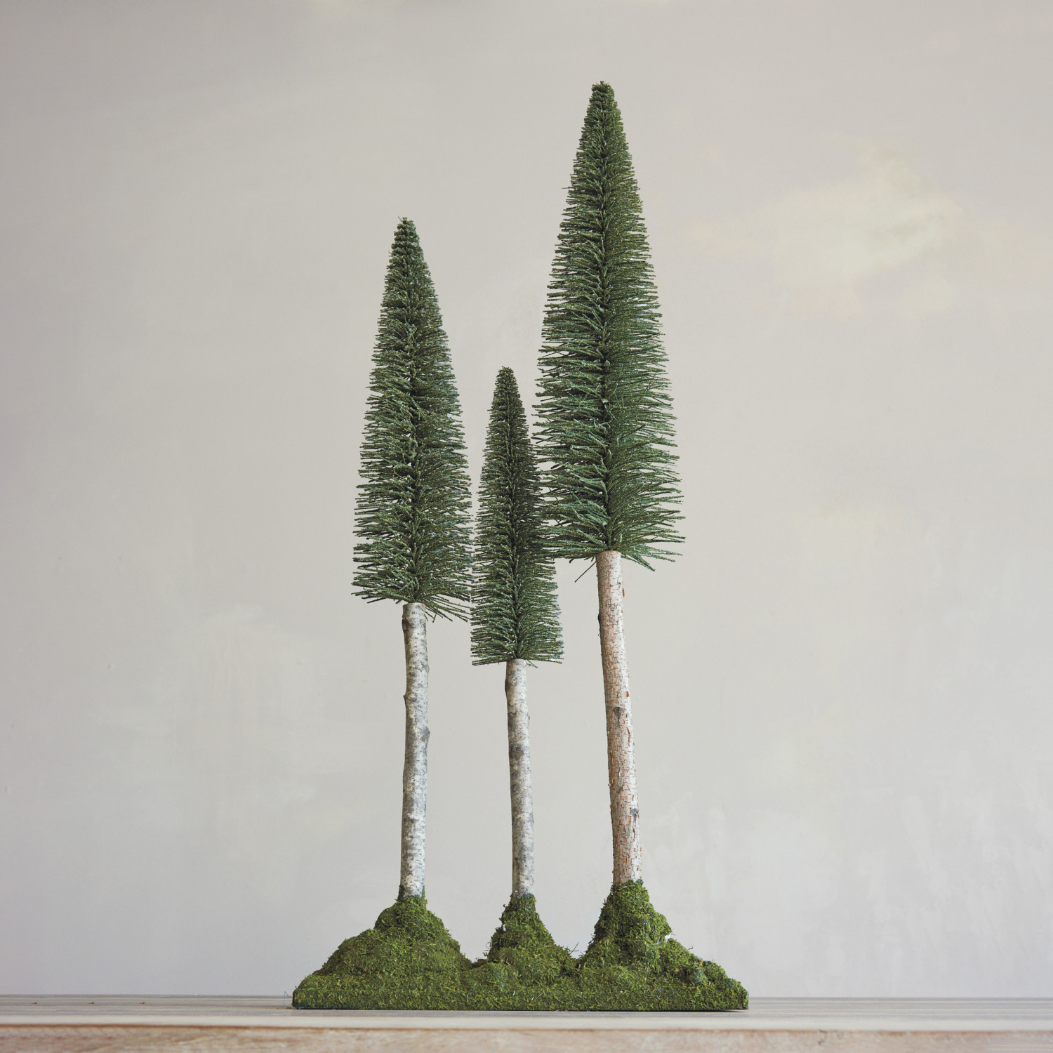 Plastic Bottle Brush Trees with Birch Wood Trunks & Moss Base