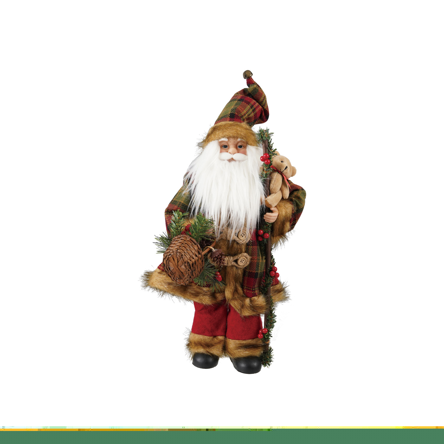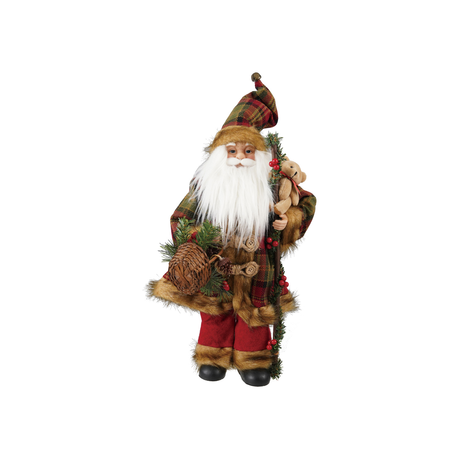 Fabric & Faux Fur Santa with Plaid Pattern Bear & Basket
