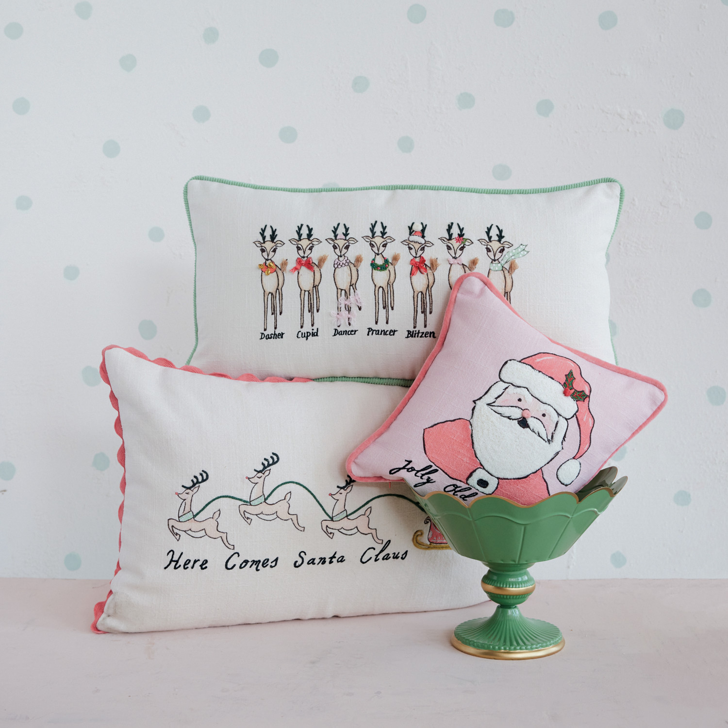 Catalog Name: 24"L x 16"H Cotton Slub Printed Lumbar Pillow w/ Embroidery, Ric Rac Trim, Santa's Sleigh, Reindeer & Velvet Back "Here Comes Santa Claus", Multi Color ©
