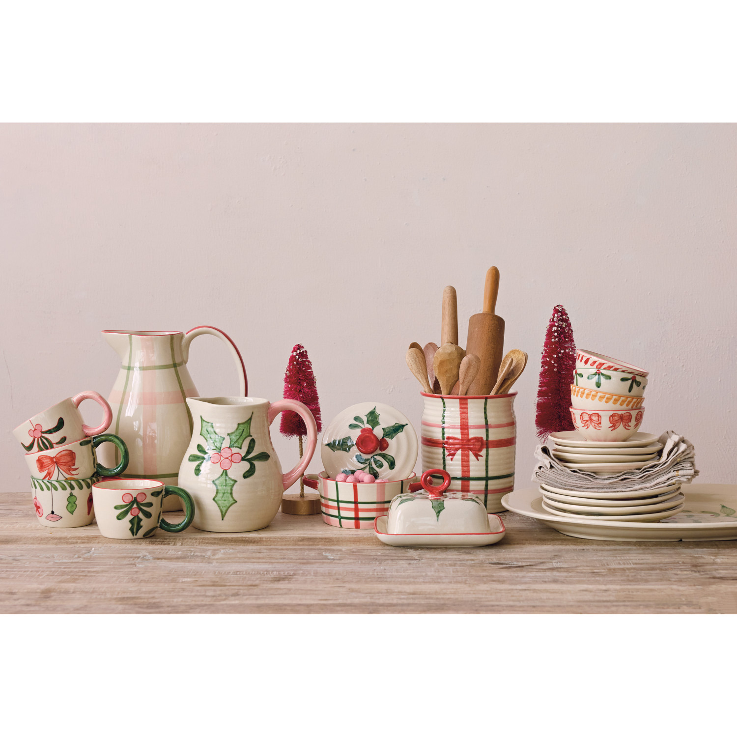 Catalog Name: 3-3/4" Round x 2-3/4"H 8 oz. Hand-Painted Stoneware Mug w/ Holiday Botanicals/Images, Colored Rim & Handle, Multi Color, 4 Styles (Each One Will Vary)